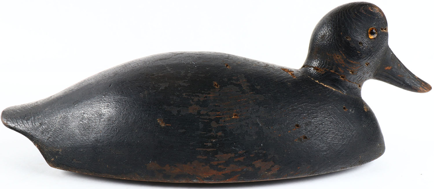 Bluebill Drake by unknown maker, glass eyes, solid wood, original paint, neck is cracked. Grade: Very Good ++ - Value: 50 to 150