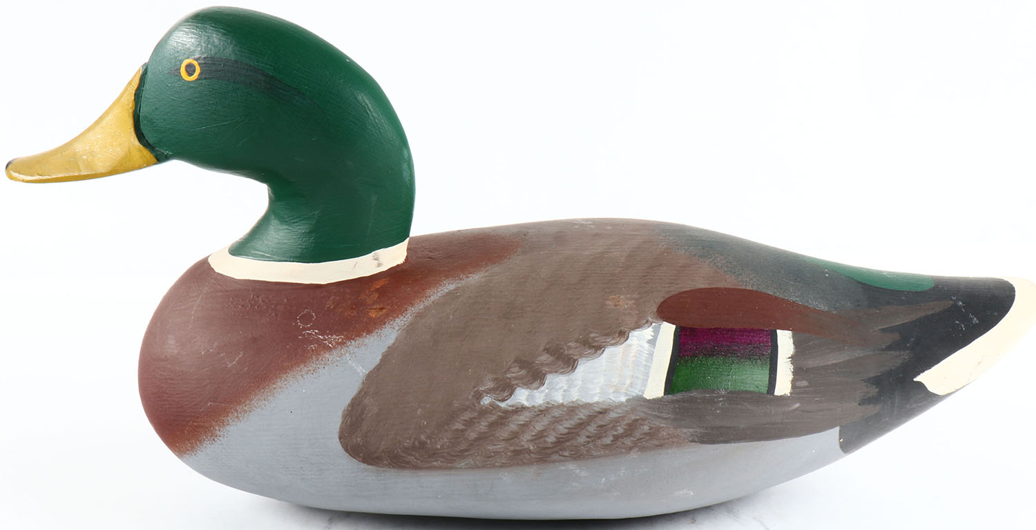 Mallard Drake by unknown maker in MD, painted eyes, solid wood, repainted, has age crack on bottom. Grade: Very Good ++ - Value: 50 to 100