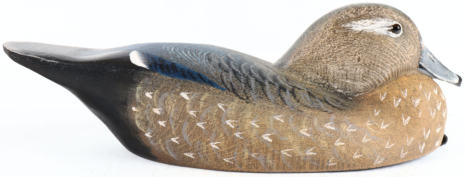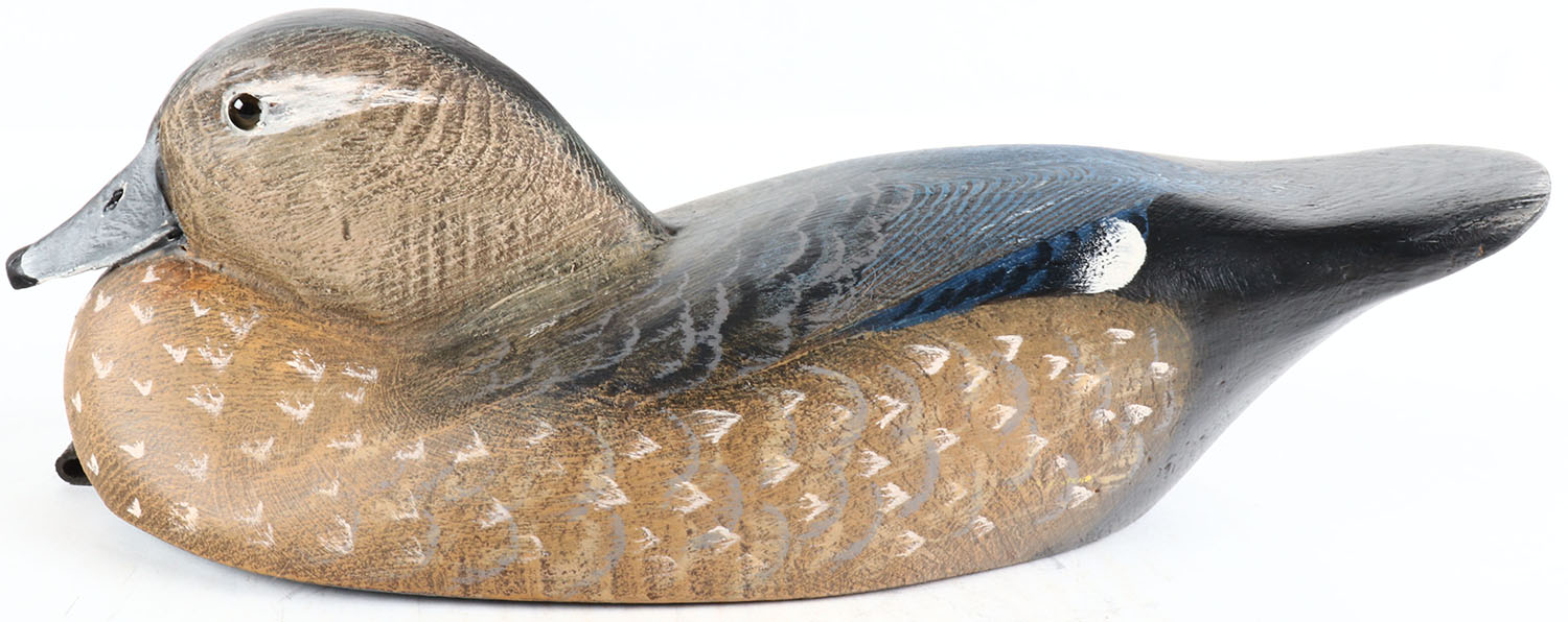 Woodduck Hen by Tom Martindale, Ontario, Canada, glass eyes, solid wood, original paint, structurally excellent, branded TM on bottom and signed. Grade: MINT - Value: 50 to 100