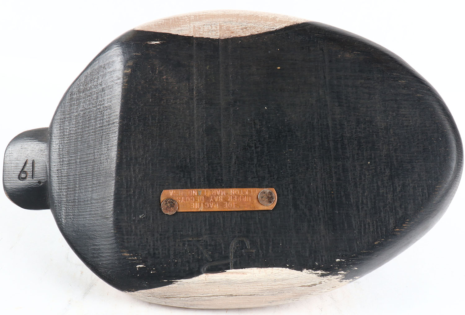 Redhead Drake by Joe Racine, Upper Bay Decoys, Elkton Maryland, painted eyes, solid wood, original paint, structurally excellent, branded JR on bottom and signed. Grade: Excellent + - Value: 40 to 80