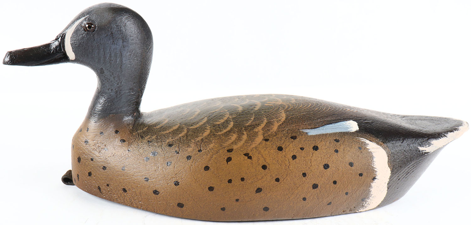 Blue Wing Teal Drake by Tom Martindale, Ontario, Canada, glass eyes, solid wood, original paint, structurally excellent, branded TM on bottom and signed. Grade: MINT - Value: 50 to 100