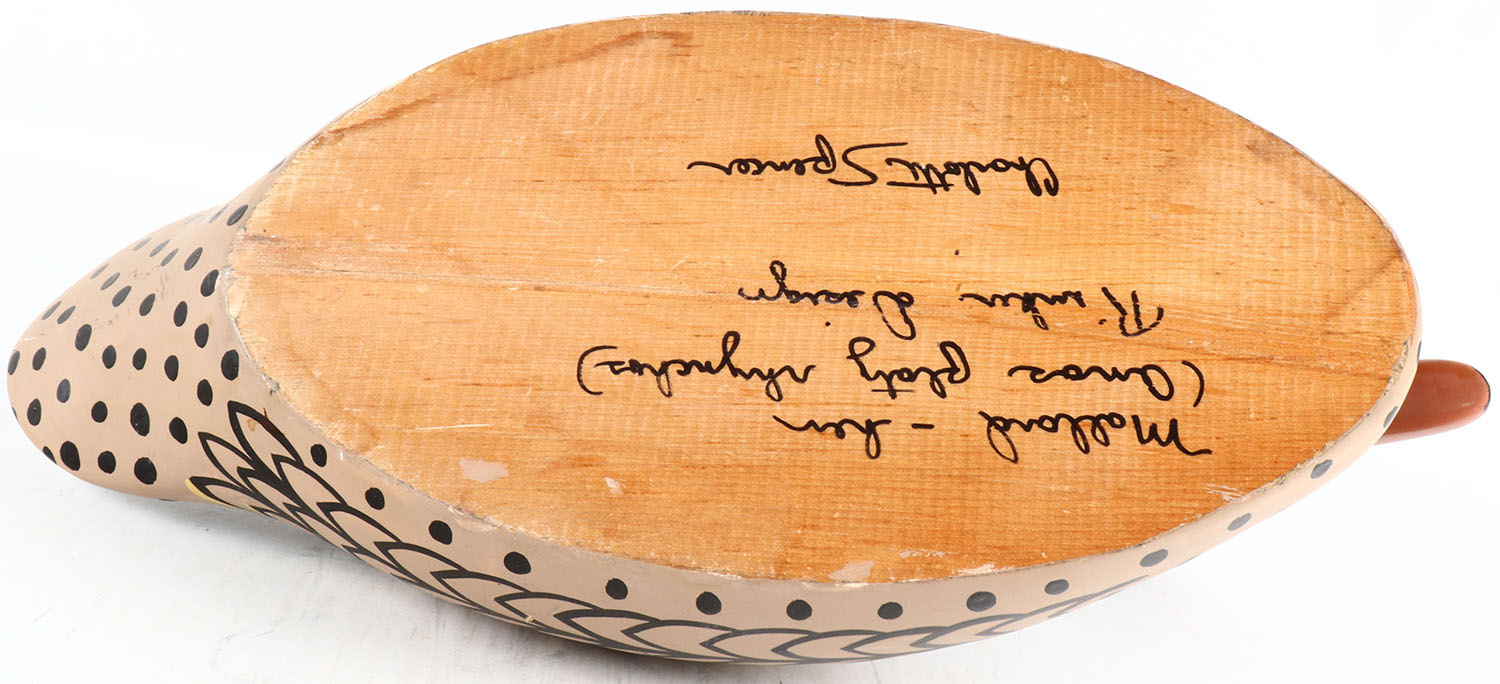 Mallard Hen by Charlotte Spencer Haver de Grace, MD, glass eyes, solid wood, original paint with nice feather detail, structurally excellent, signed on bottom. Grade: MINT + - Value: 40 to 80