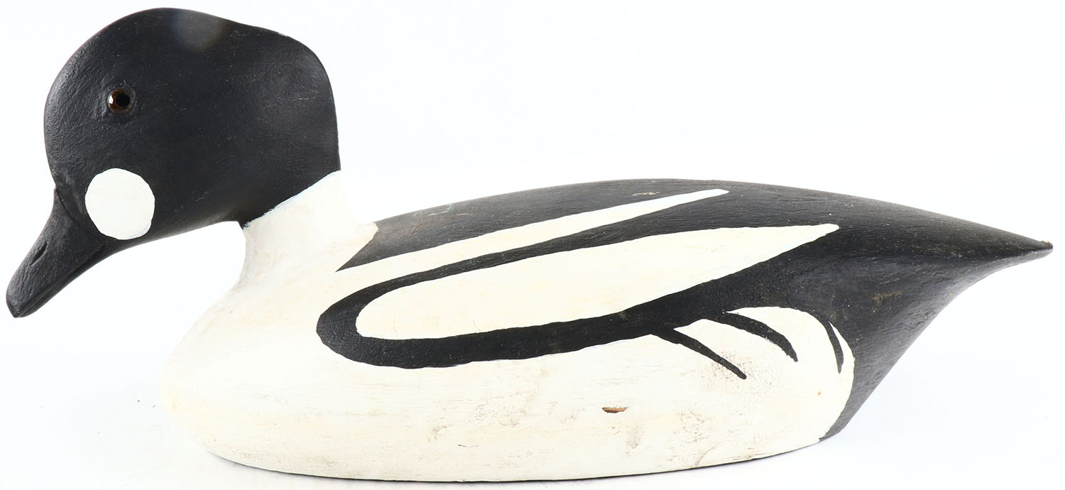 Goldeneye Drake by Maynard Caine, Ontario, Canada, glass eyes, solid wood, original paint, structurally excellent, branded M and signed on bottom. Grade: Excellent - Value: 50 to 100