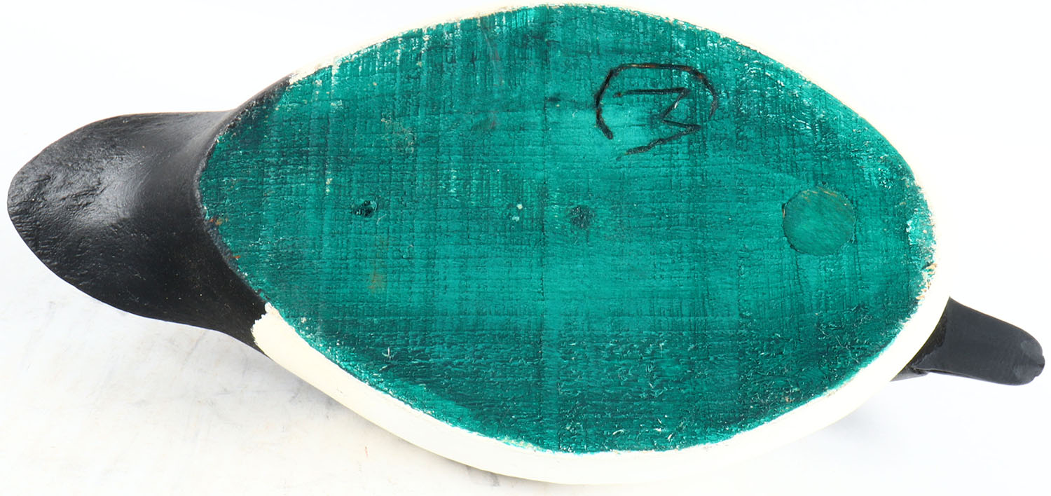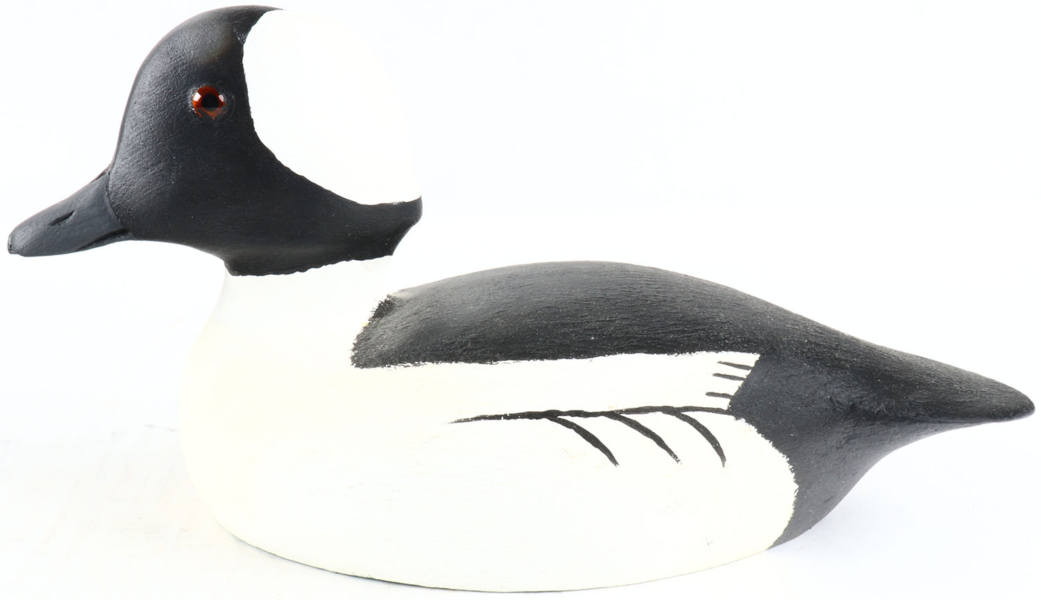 Bufflehead Drake by Maynard Caine, Ontario, Canada, glass eyes, hollow wood, original paint, structurally excellent, branded M on bottom. Grade: MINT - Value: 50 to 100