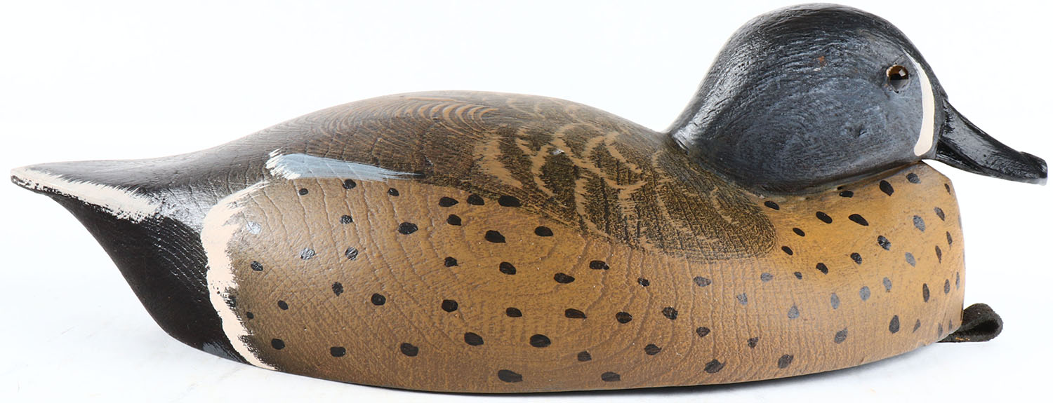 Blue-wing Teal Drake by Tom Martindale, Ontario, Canada, glass eyes, solid wood, original paint, structurally excellent, branded TM and signed on bottom. Grade: MINT - Value: 50 to 100