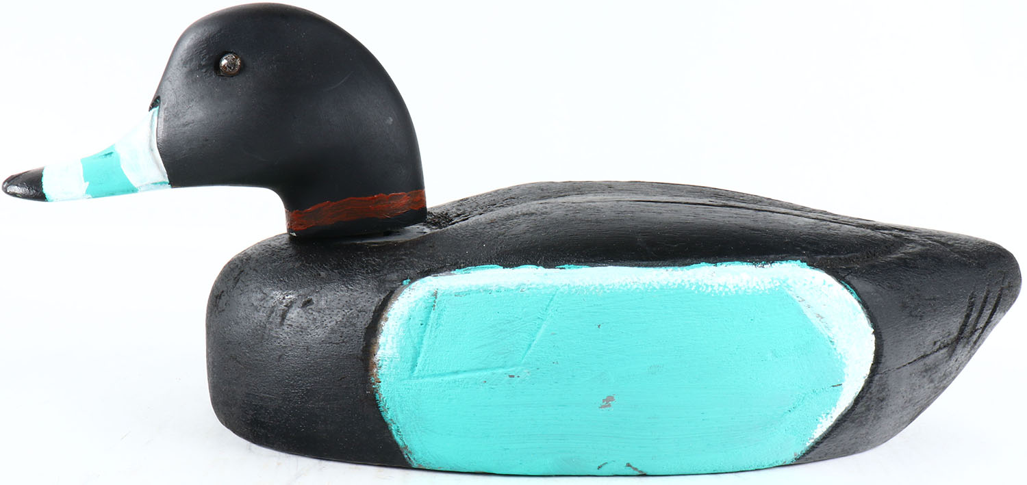 Ring Neck Drake by unknown maker, glass eyes, solid balsa wood, original paint, structurally excellent. Grade: Excellent - Value: 10 to 50