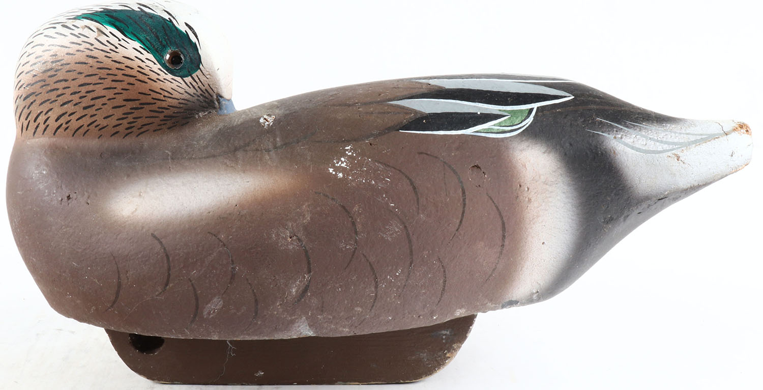 Preening Widgeon Drake by Michael and Susan Veasy, glass eyes, solid wood, original paint, tail is slightly cracked, signed on bottom. Grade: Very Good ++ - Value: 50 to 100