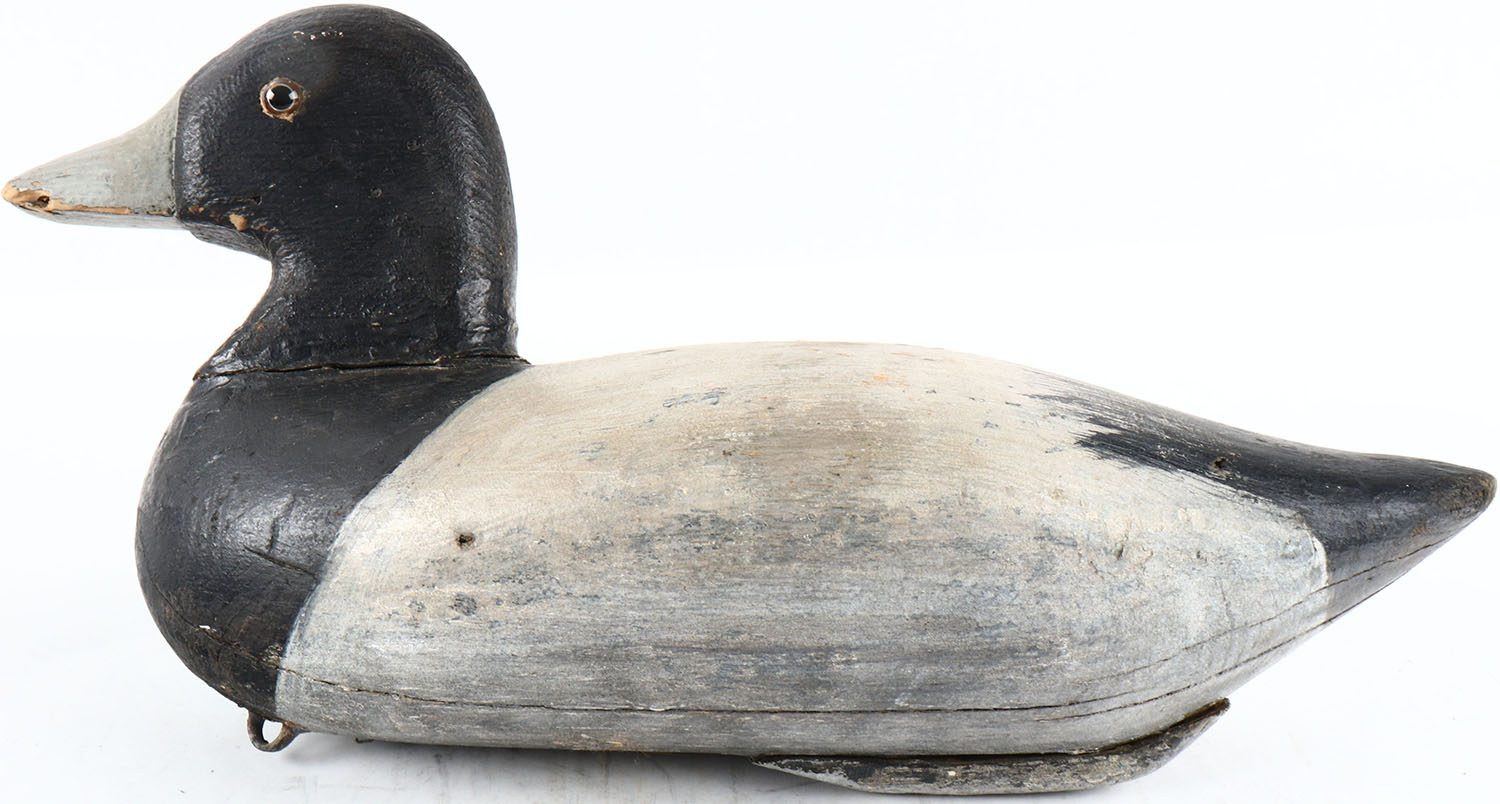 Bluebill Drake by unknown maker, glass eyes, solid wood, original paint, has age cracks on back and bottom. Grade: Very Good ++ - Value: 50 to 100