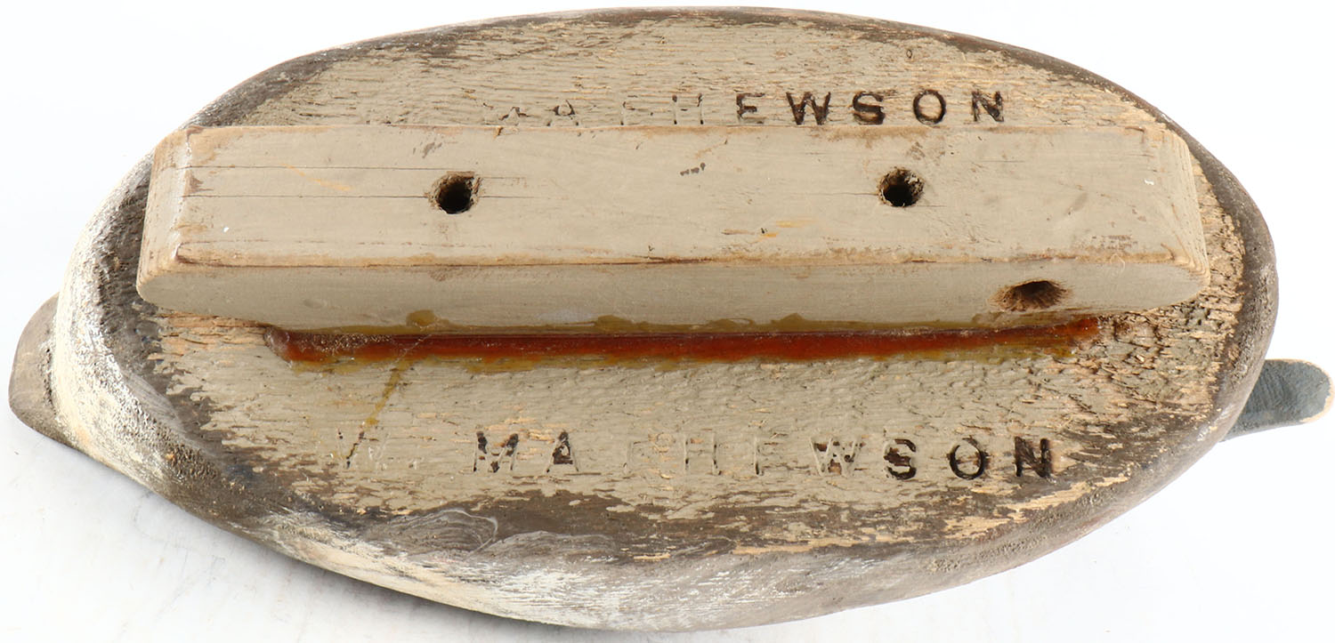 Widgeon by W. Mathewson, glass eyes, solid wood, original paint, structurally excellent, branded by W. MATHEWSON on bottom. Grade: Very Good ++ - Value: 50 to 100