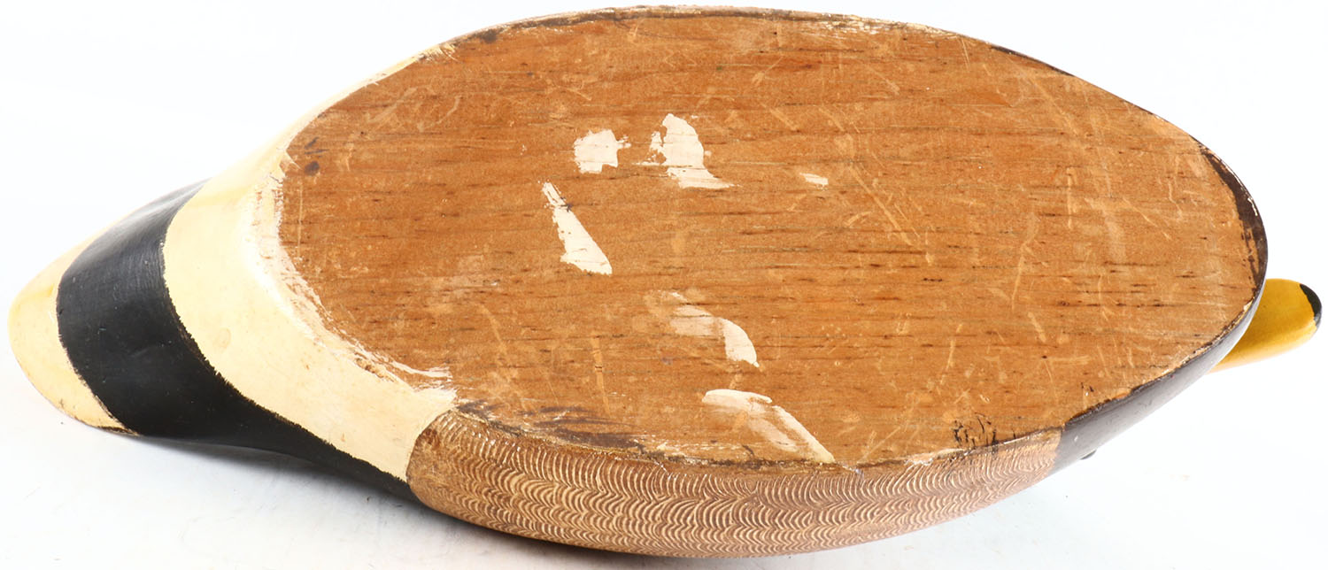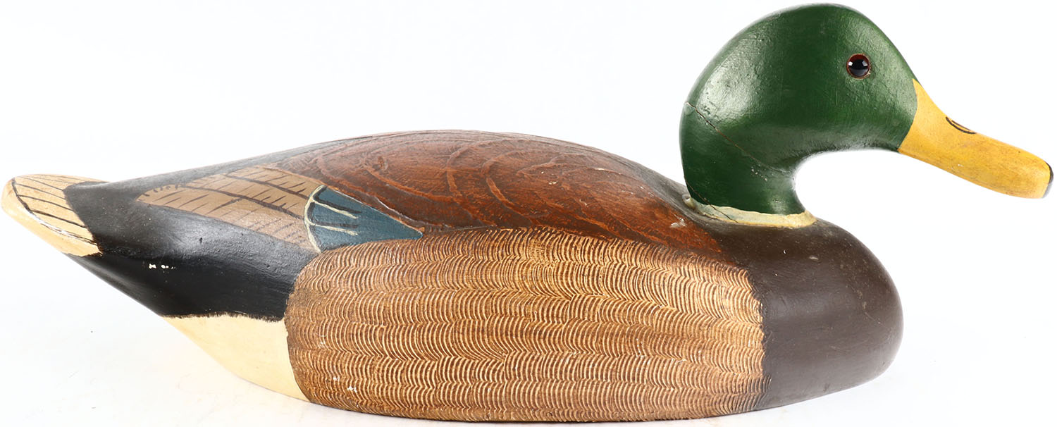 Mallard Drake by unknown maker, glass eyes, solid wood, original paint with comb painting, structurally excellent. Grade: Excellent ++ - Value: 50 to 100