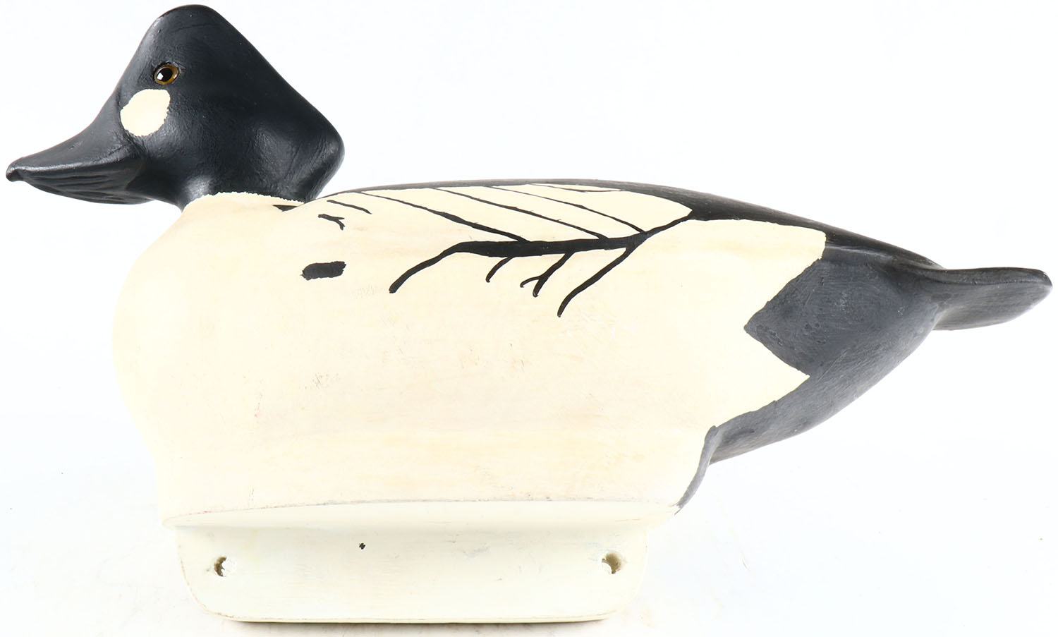 Goldeneye Drake by Bill Dorofy, glass eyes, hollow wood, original paint, structurally excellent, signed on bottom. Grade: Excellent + - Value: 50 to 100