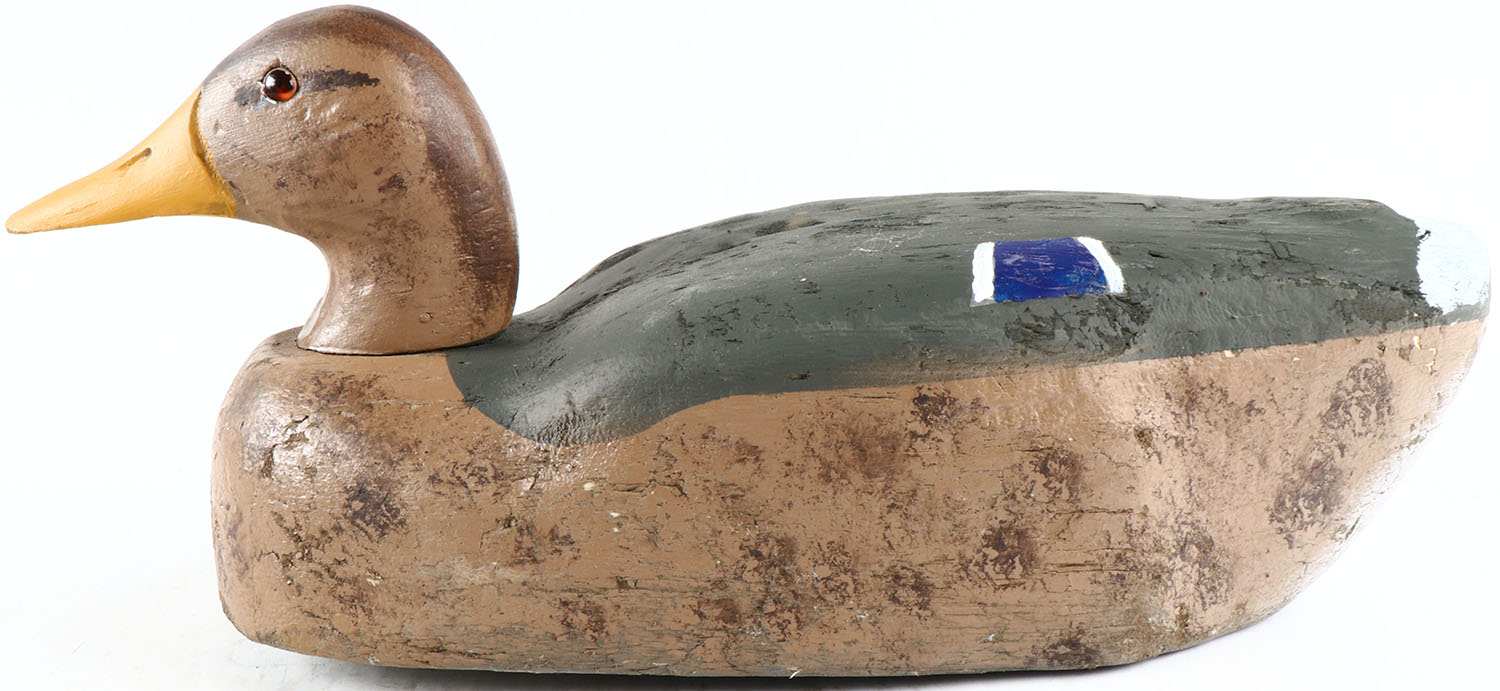 Mallard Hen by unknown maker, glass eyes, solid balsa wood, original paint, has age cracks on back and bottom. Grade: Very Good ++ - Value: 50 to 100