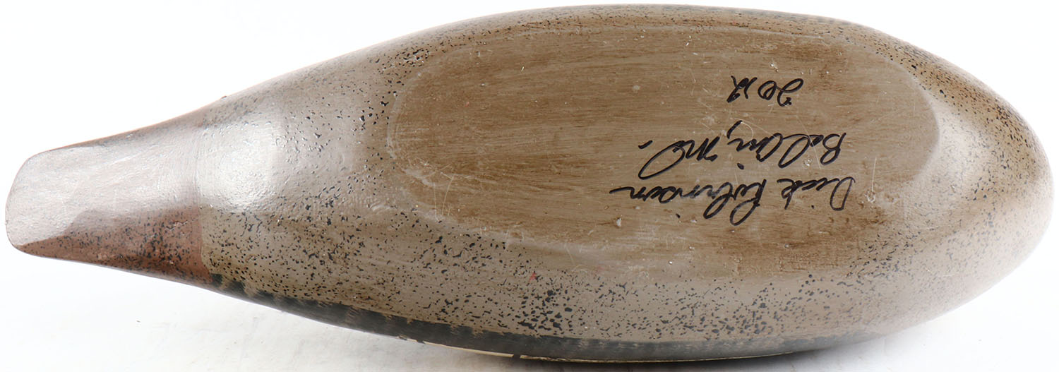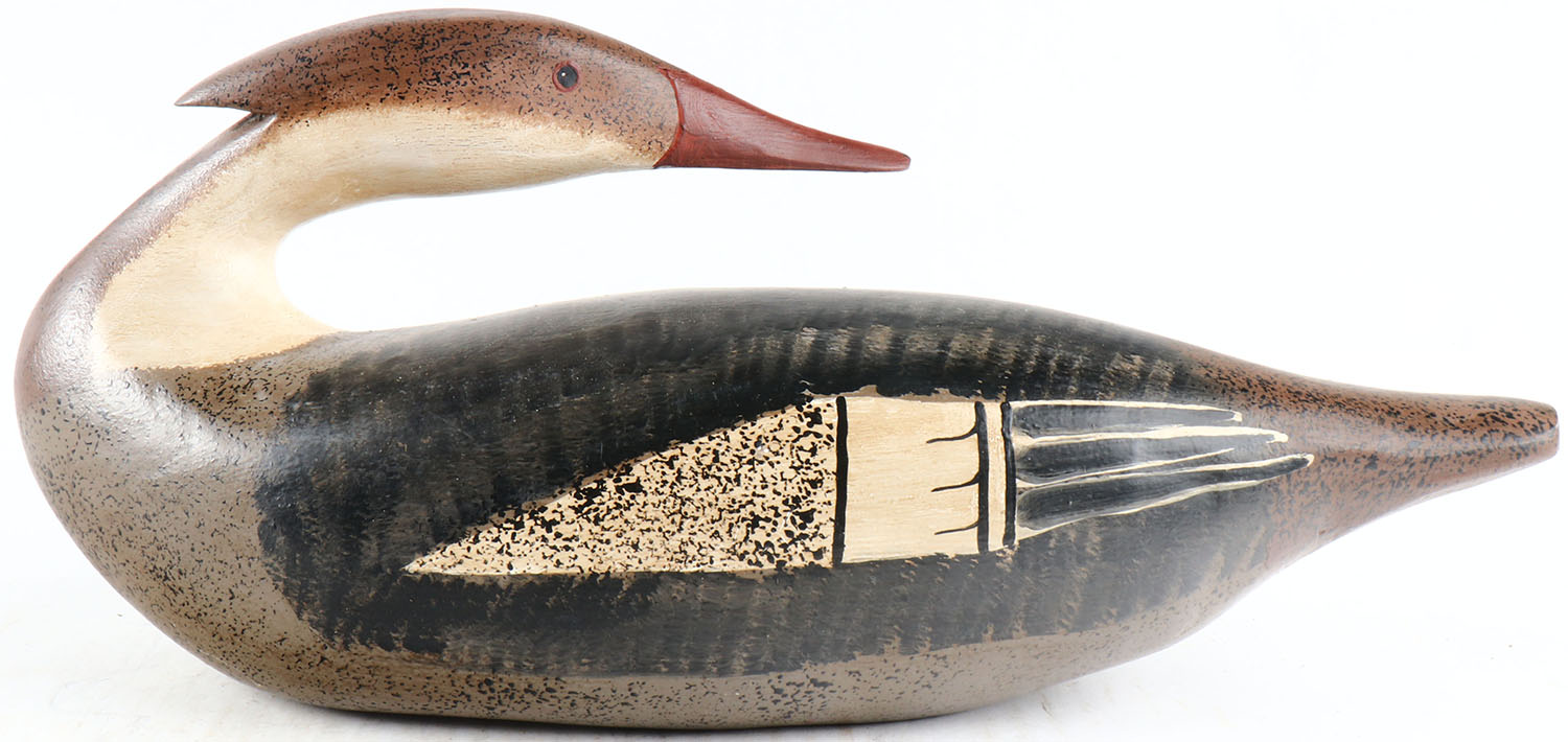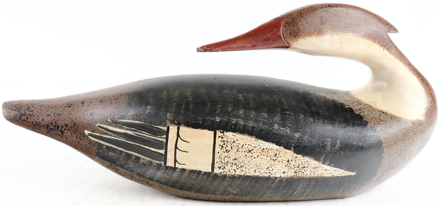 Preening Merganser Hen by Dick Robinson, Bel Air, MD. Painted eyes, solid wood, original paint, structurally excellent. Grade: MINT - Value: 50 to 100