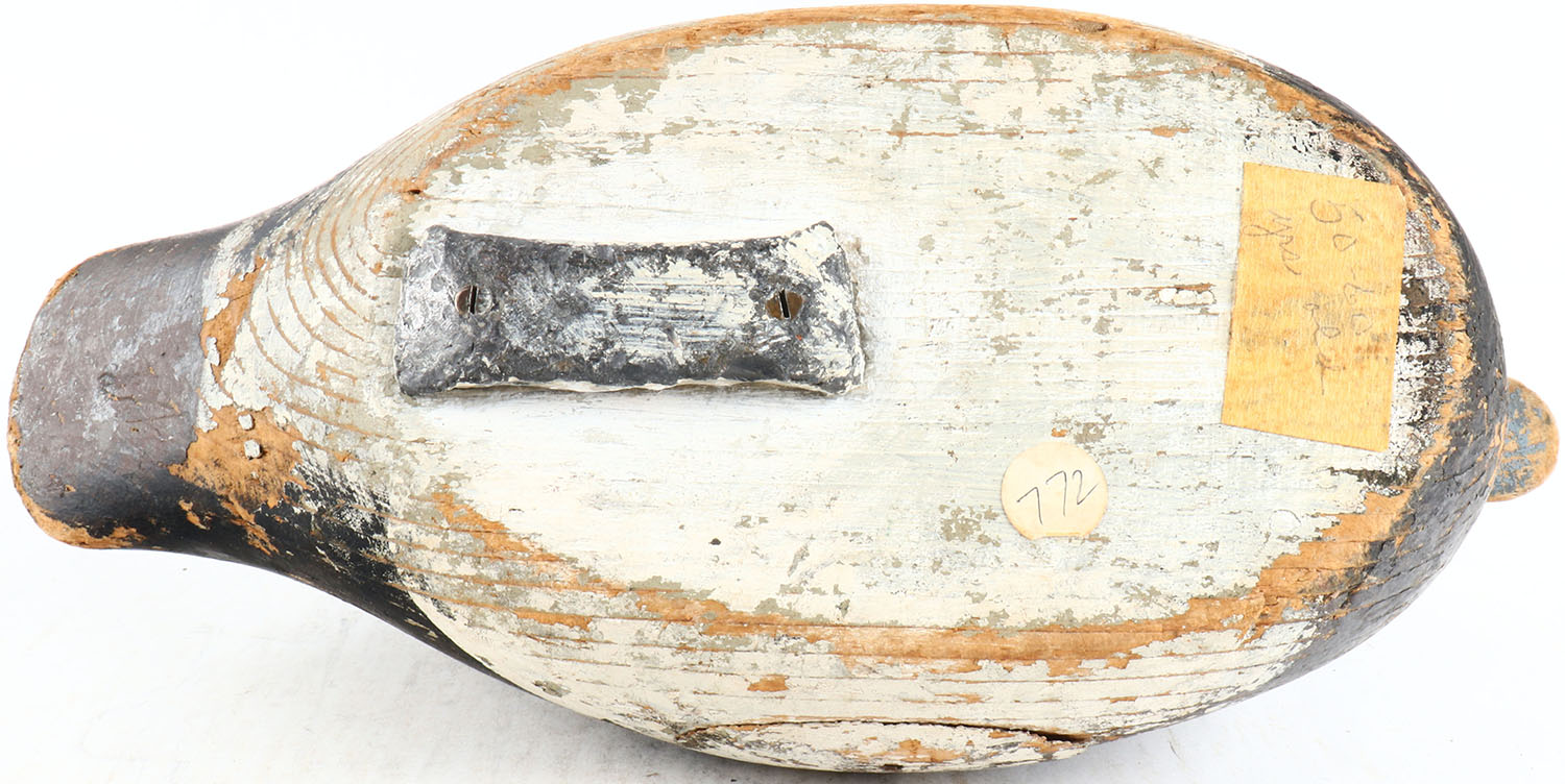 Bluebill Drake by unknown maker, glass eyes, solid wood, original paint, head is loose. Grade: Very Good ++ - Value: 50 to 100