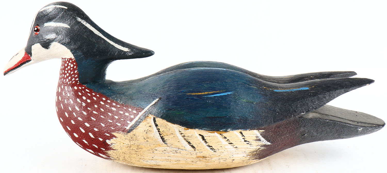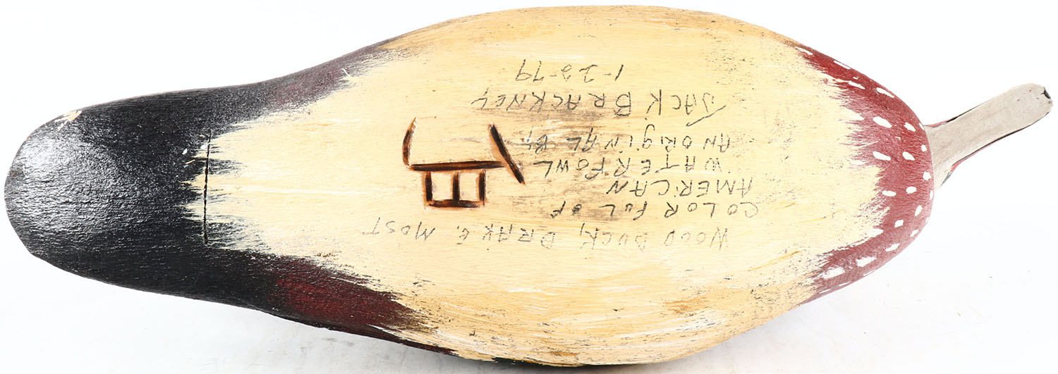 Woodduck Drake by American Waterfowl, Jack Brackney, glass eyes, hollow wood, original paint, structurally excellent, signed on bottom. Grade: Excellent ++ - Value: 50 to 100