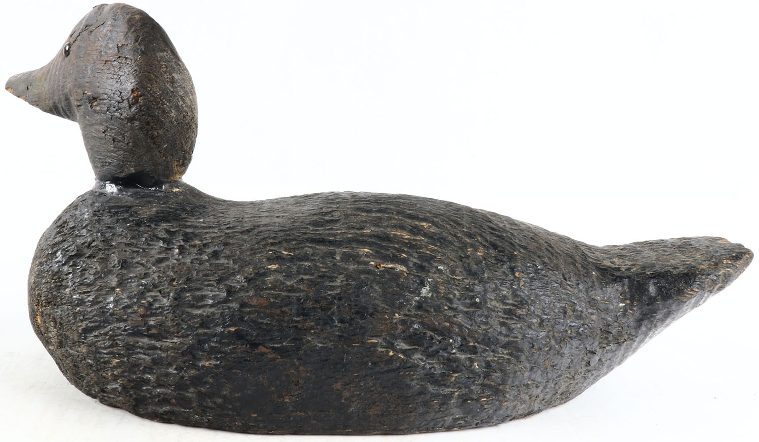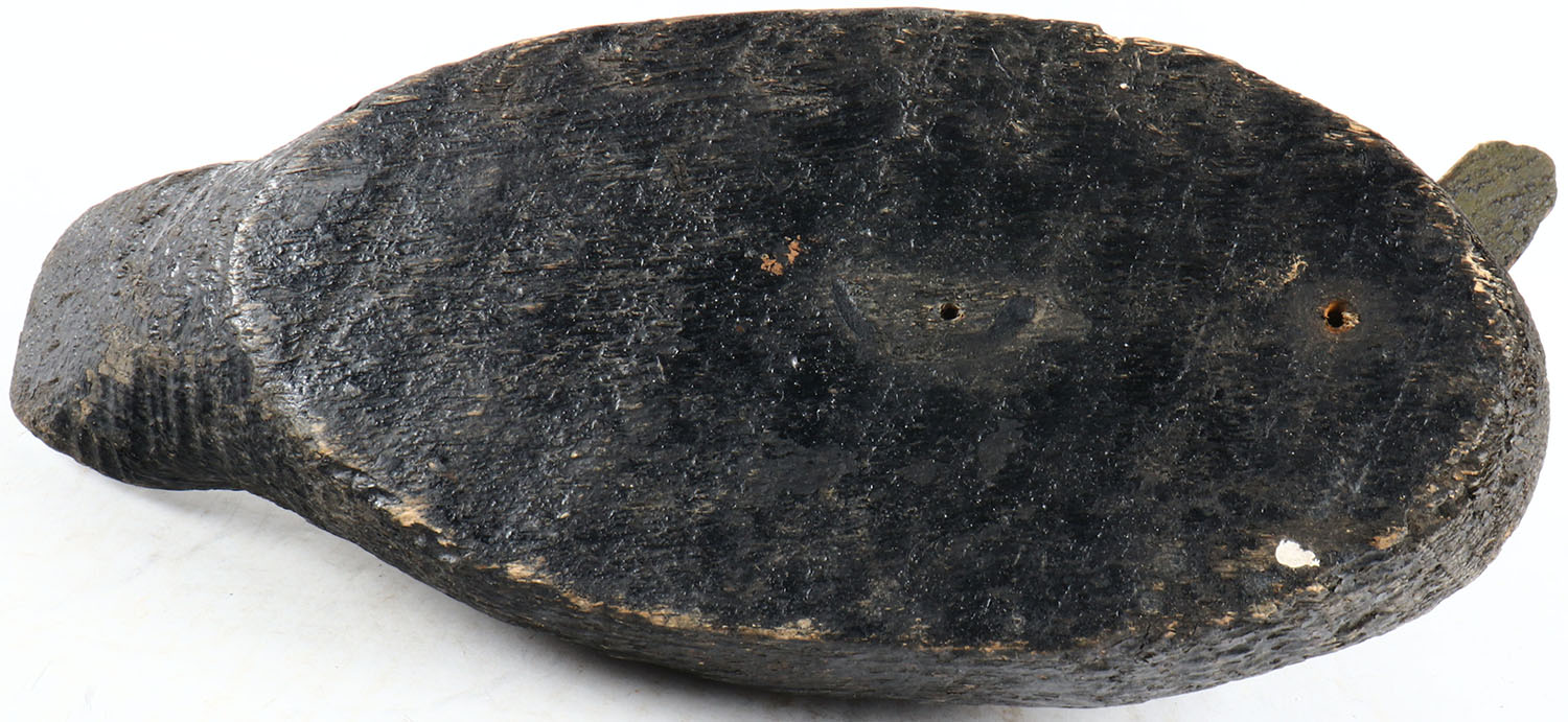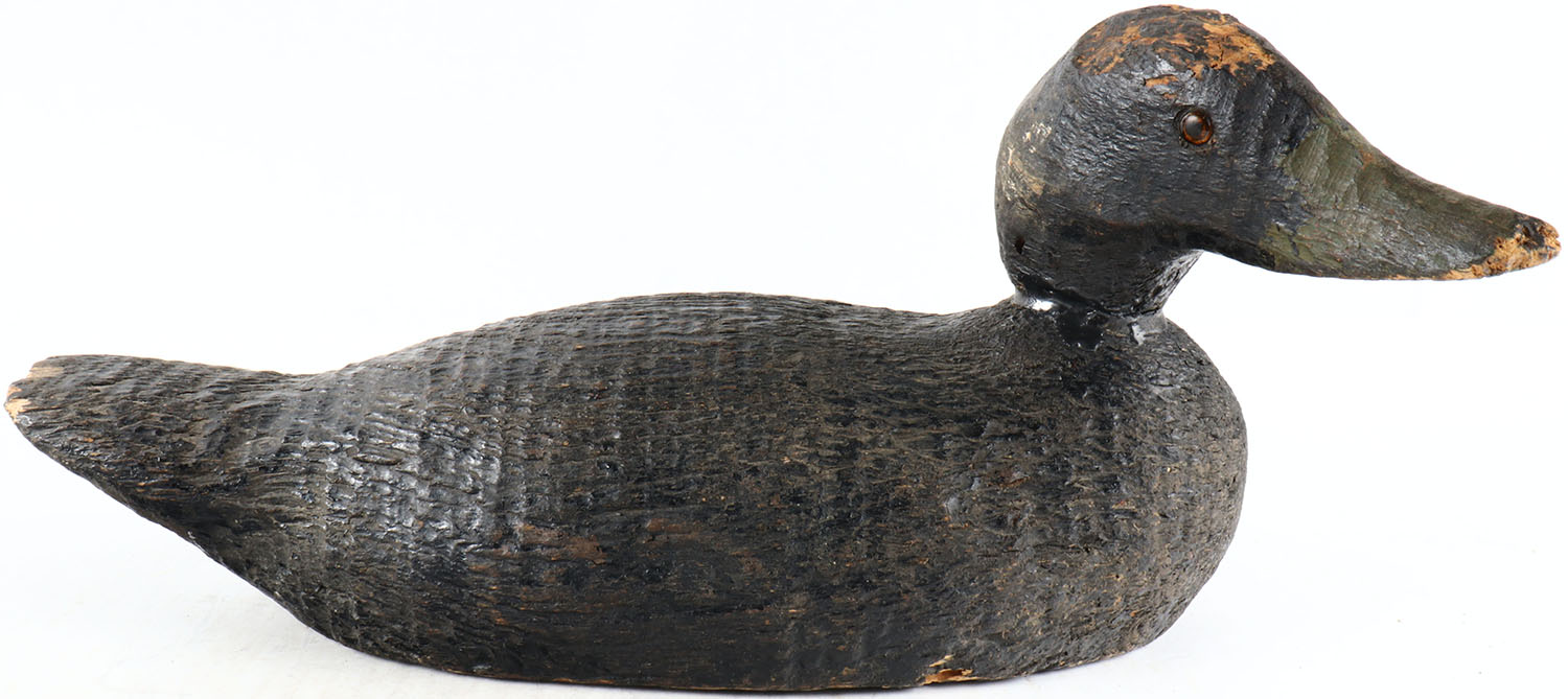 Black Duck by unknown maker, glass eyes, solid wood, original paint, head and tail have chips in it. Grade: Very Good ++ - Value: 50 to 100