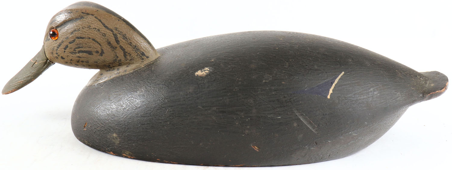 Black Duck by unknown maker, glass eyes, solid wood, original paint, tail is broken, bill has been repaired. Grade: Very Good + - Value: 50 to 100