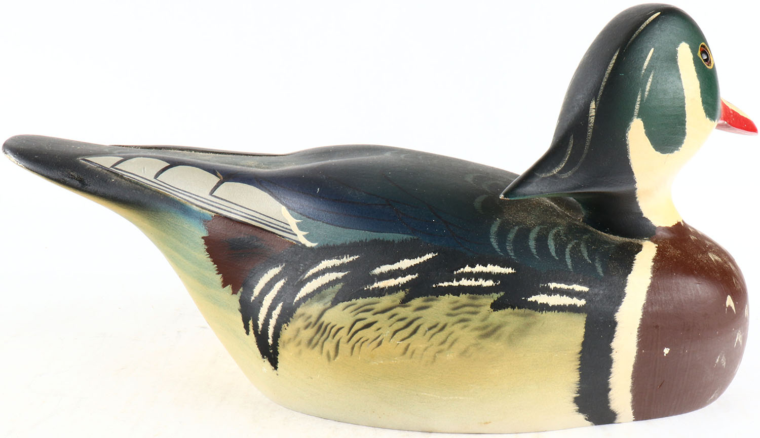 Woodduck Drake by unknown maker, glass eyes, solid wood, original paint, structurally excellent. Grade: MINT - Value: 50 to 100
