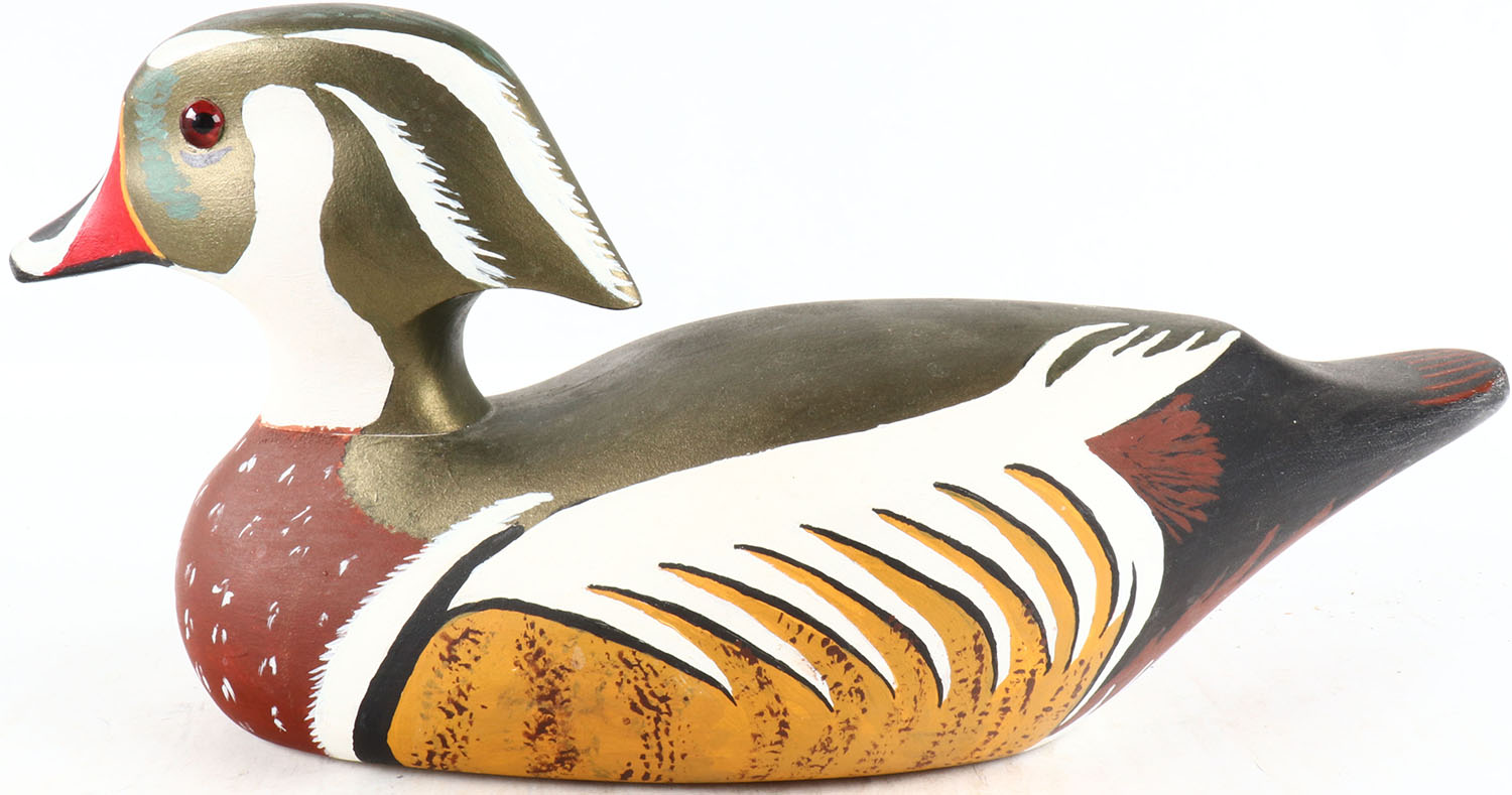 Woodduck Drake by The Wooden Bird Factory, glass eyes, solid wood, original paint, structurally excellent, branded by THE WOODEN BIRD FACTORY on bottom. Grade: MINT - Value: 50 to 100