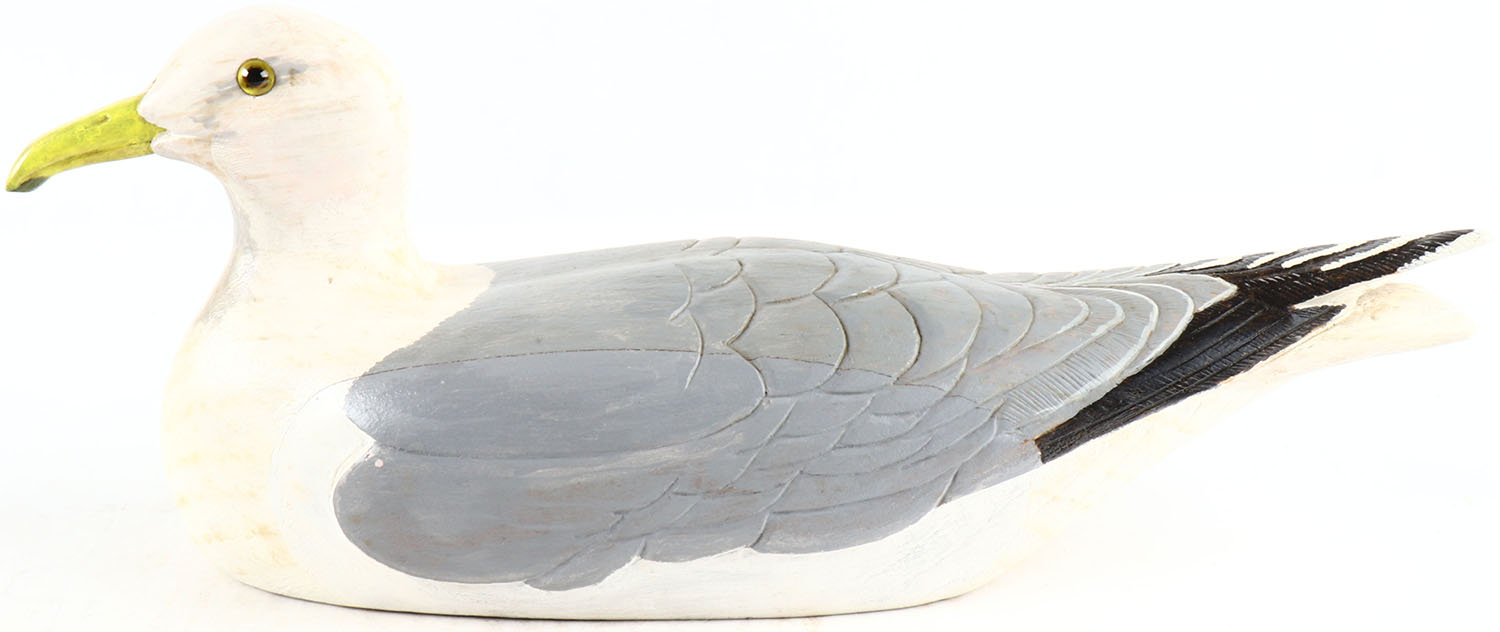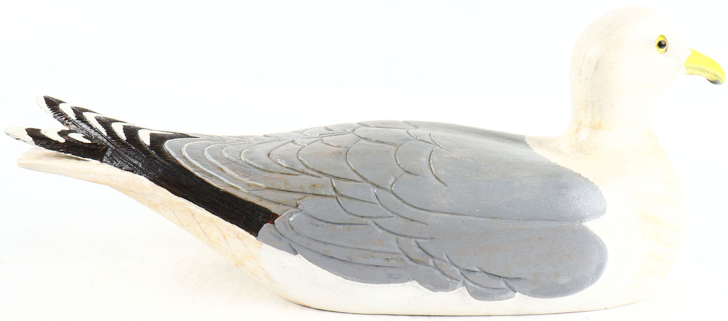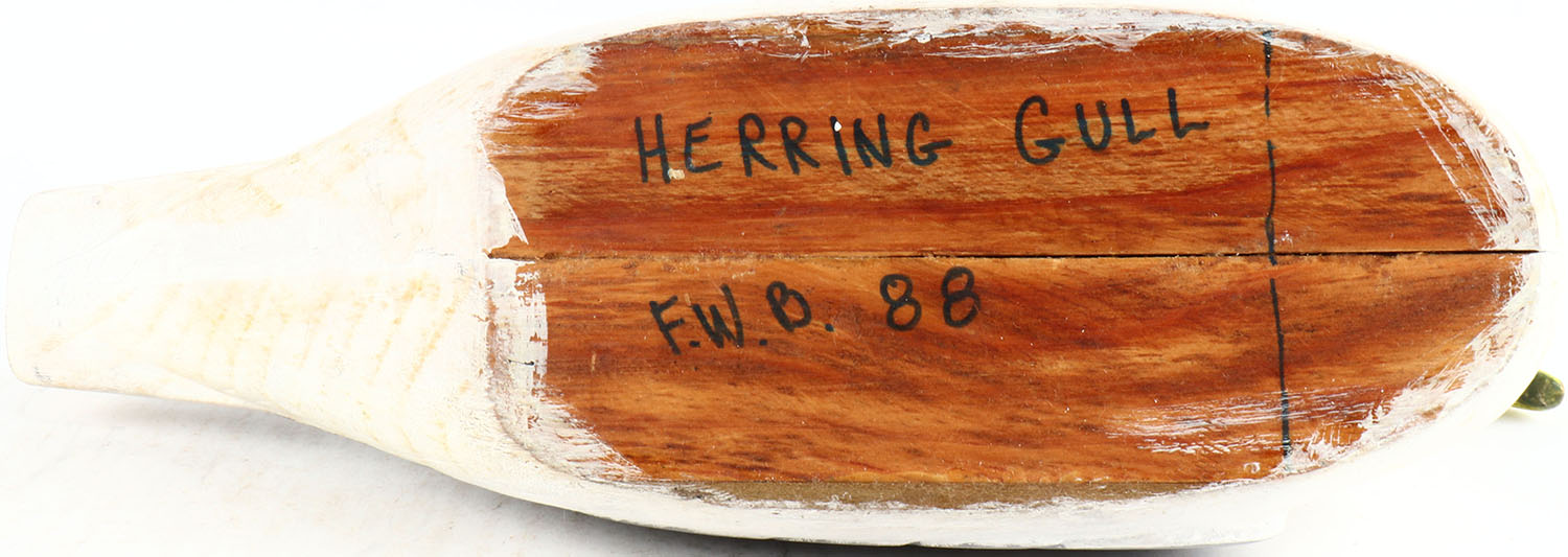 Herring Gull by unknown maker, glass eyes, solid wood, original paint, structurally excellent, signed on bottom. Grade: Excellent + - Value: 50 to 100