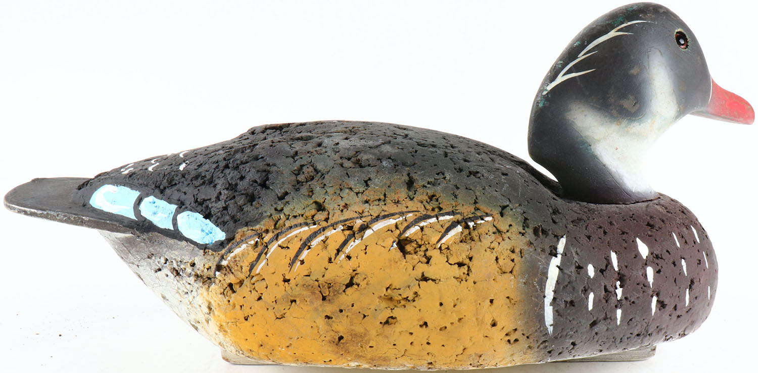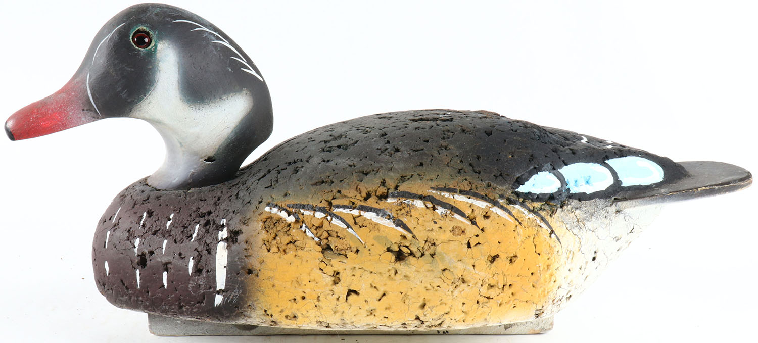 Woodduck Drake by M, glass eyes, solid cork body, original paint, structurally excellent, branded M on bottom. Grade: Excellent + - Value: 50 to 100