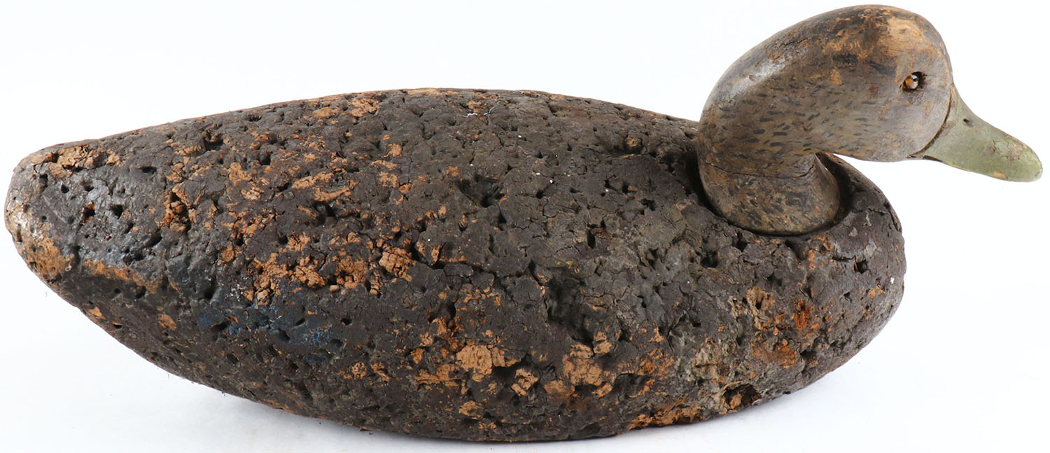Black Duck by unknown maker, glass eyes, solid cork body, original paint, structurally excellent. Grade: Very Good ++ - Value: 50 to 100