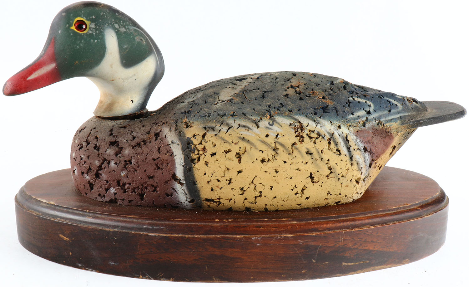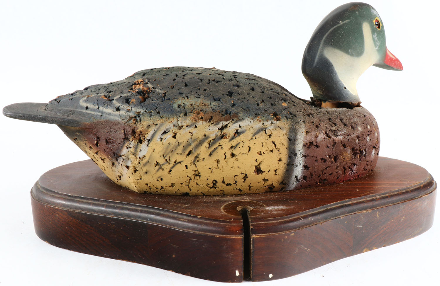 Woodduck Drake by unknown maker, glass eyes, solid cork body on wood base, head comes off, original paint. Grade: Very Good ++ - Value: 50 to 100