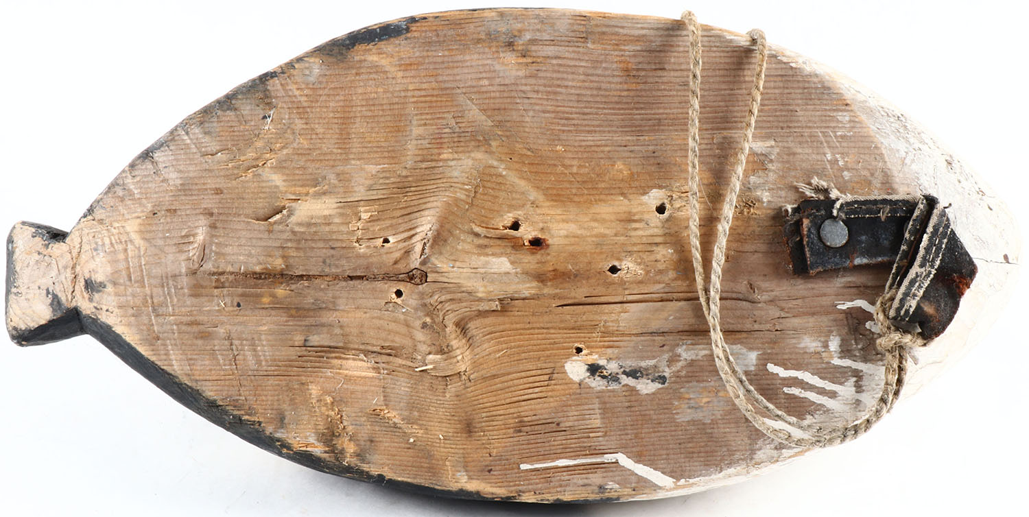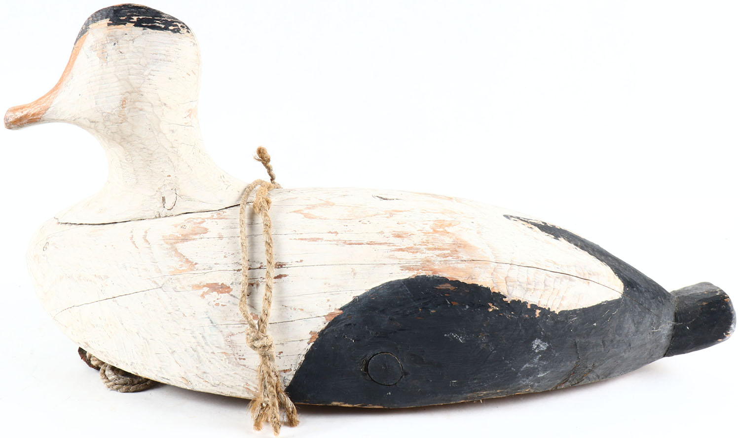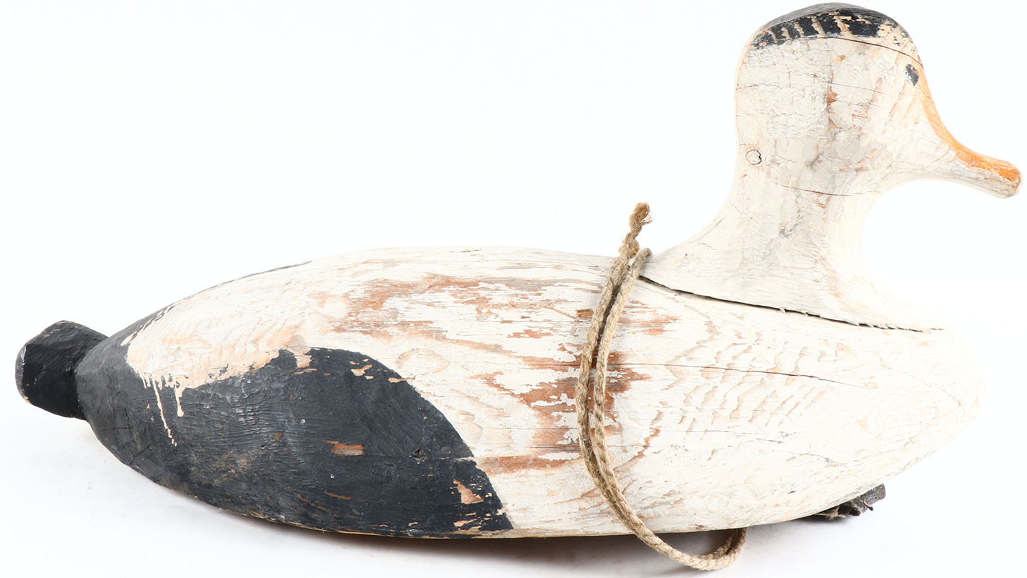 Common Eider by unknown maker, painted eyes, solid wood, original paint, has age cracks on back. Grade: Very Good ++ - Value: 50 to 100