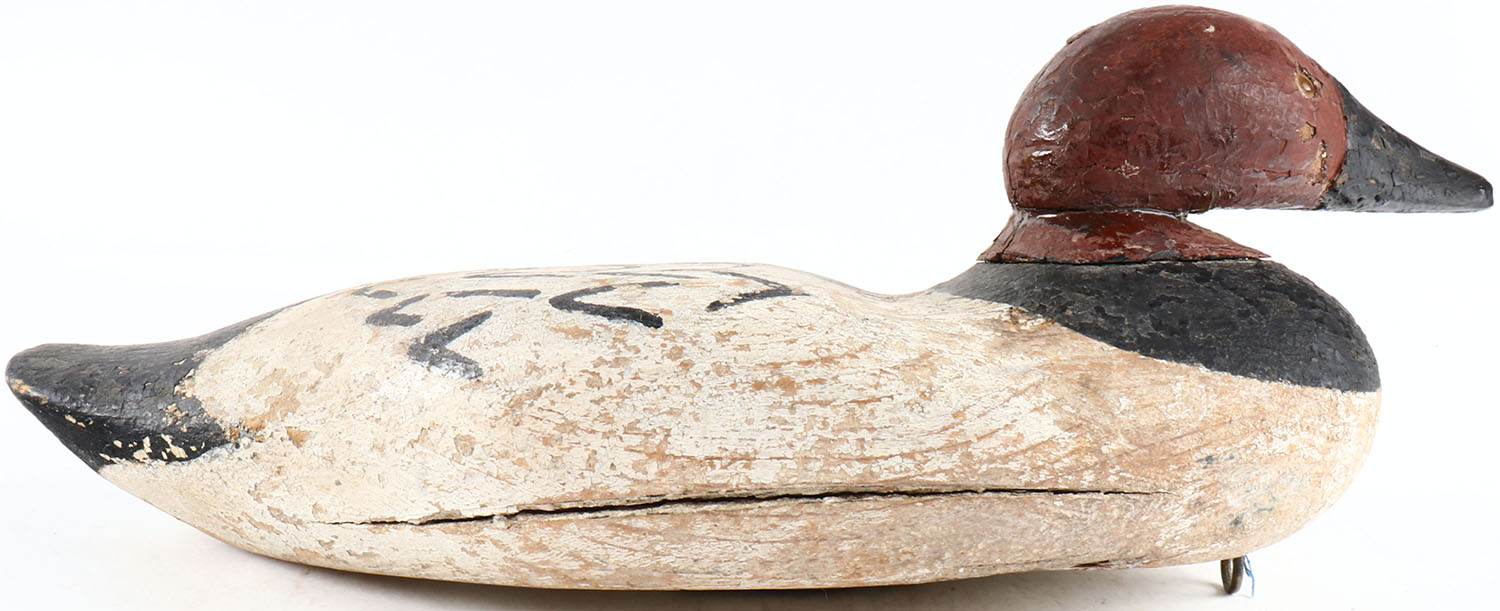 Canvasback Drake by unknown maker, glass eyes, one is missing, solid wood, original paint. Grade: Very Good + - Value: 50 to 100