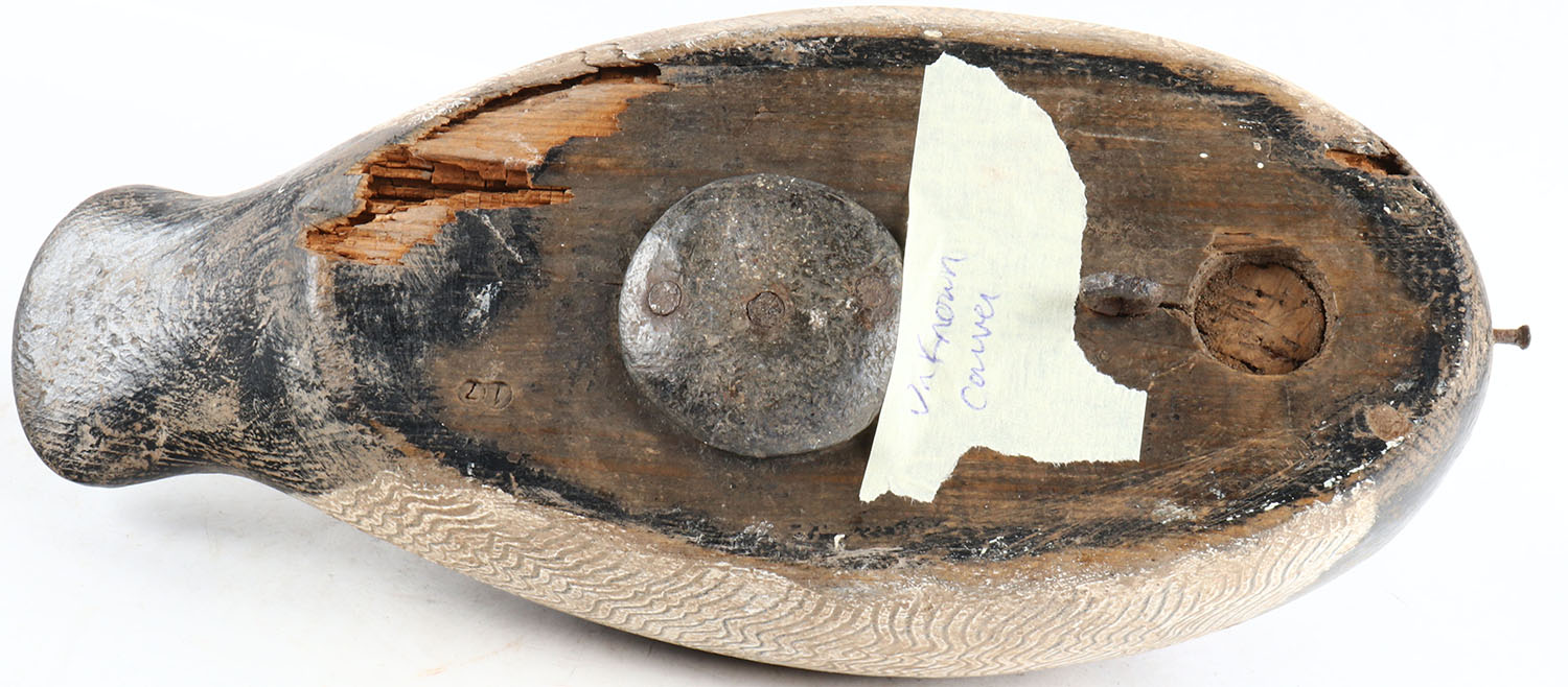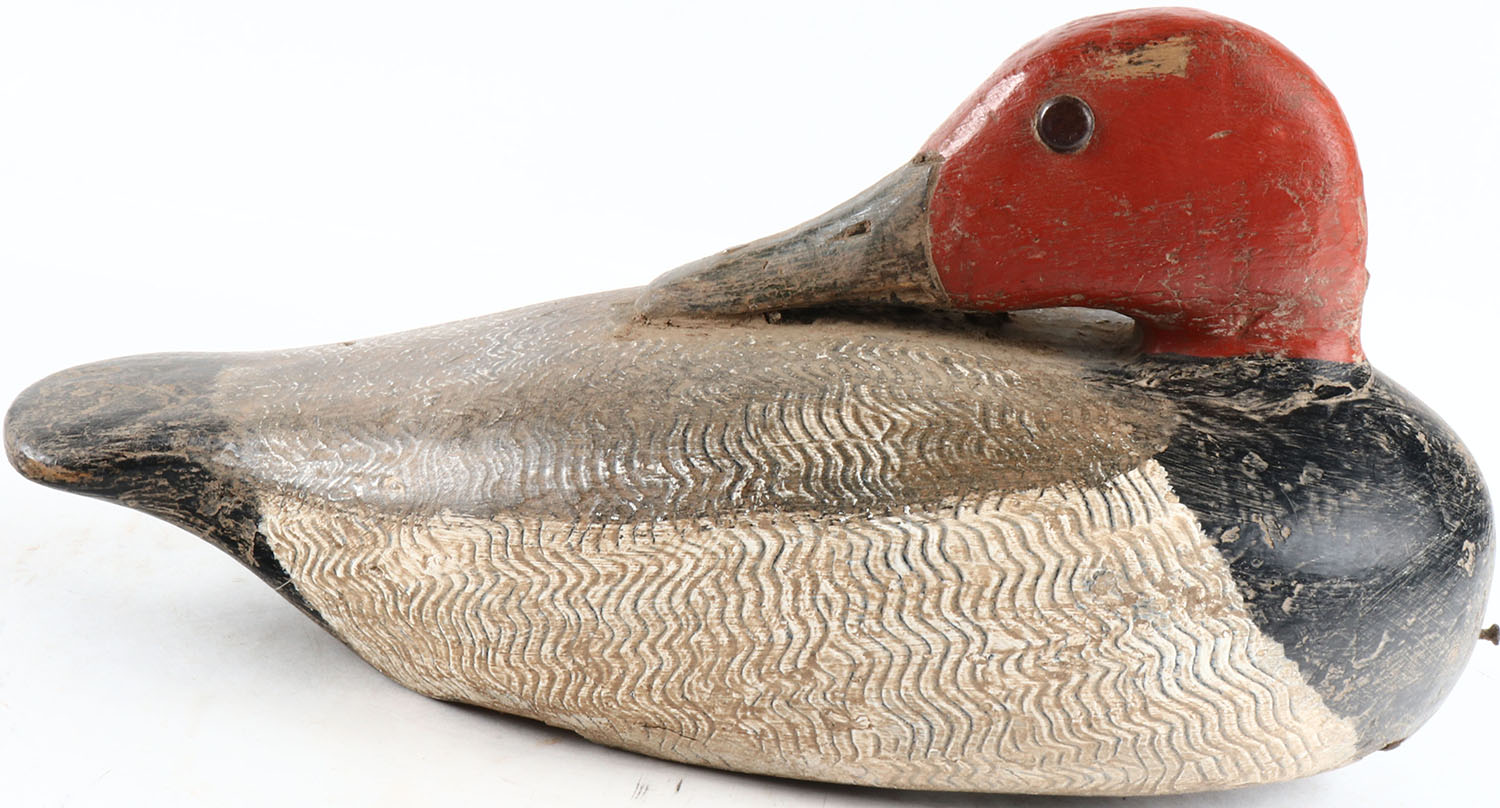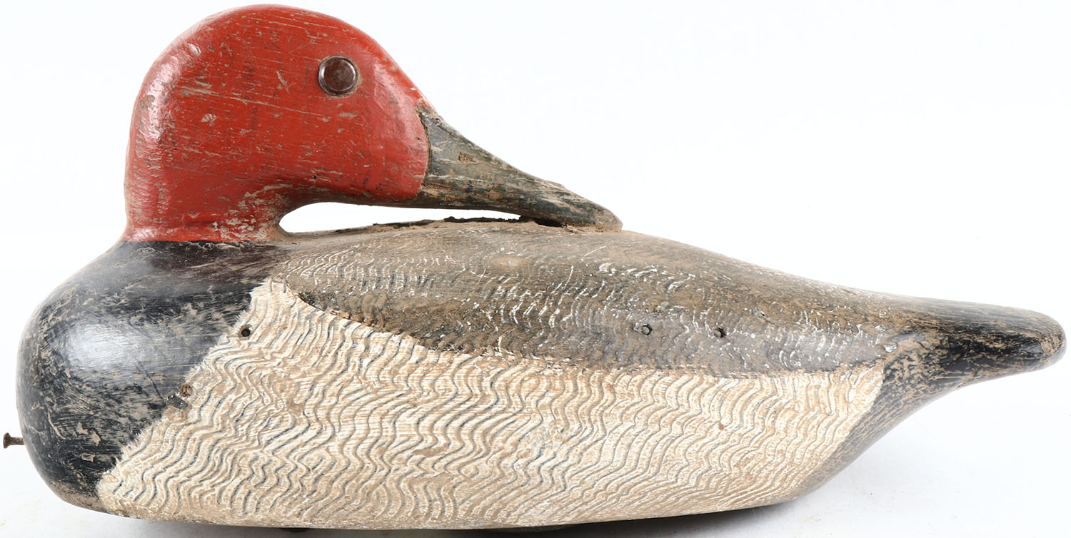Sleeping Canvasback Drake by unknown maker, tack eyes, solid wood, original paint with comb painting, structurally excellent. Grade: Excellent + - Value: 50 to 100