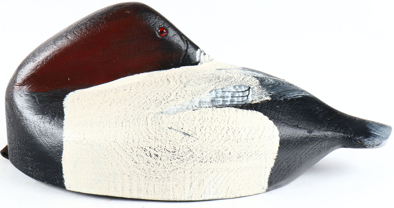 Sleeping Canvasback Drake by Tom Martindale, Ontario, Canada, glass eyes, solid wood, original paint, structurally excellent, branded TM and signed on bottom. Grade: MINT - Value: 50 to 100