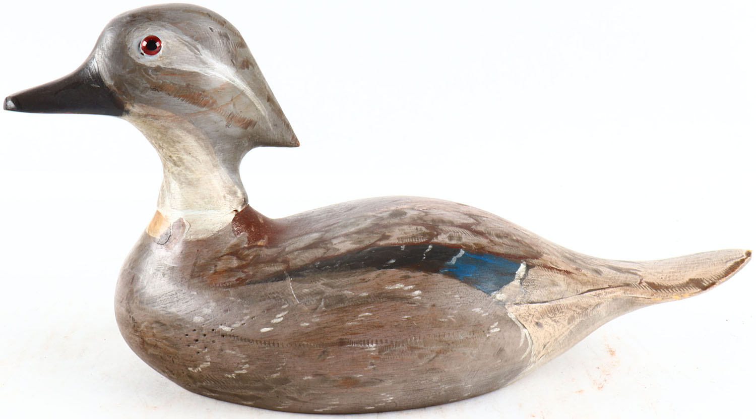 Woodduck Hen by E. Howell, glass eyes, solid wood, original paint, structurally excellent, signed on bottom. Grade: MINT - Value: 50 to 100
