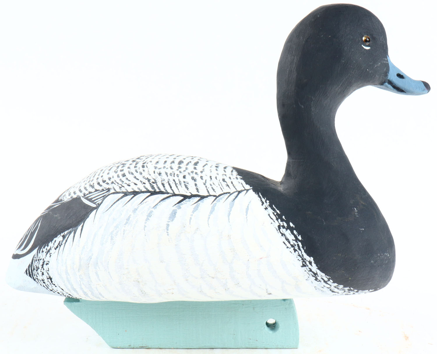 Bluebill Drake by Tim Lawson, Manchester Iowa, glass eyes, solid wood, original paint, structurally excellent, signed on bottom. Grade: MINT - Value: 40 to 80