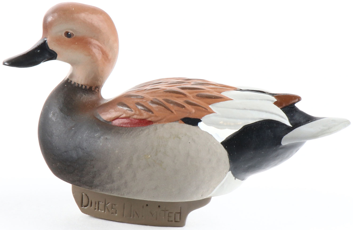 Miniature Gadwall by Jett Brunet, Ducks Unlimited, Memphis, TN. Painted eyes, solid wood, original paint, structurally excellent, branded on bottom, in original box, Grade: MINT + - Value: 6 to 30