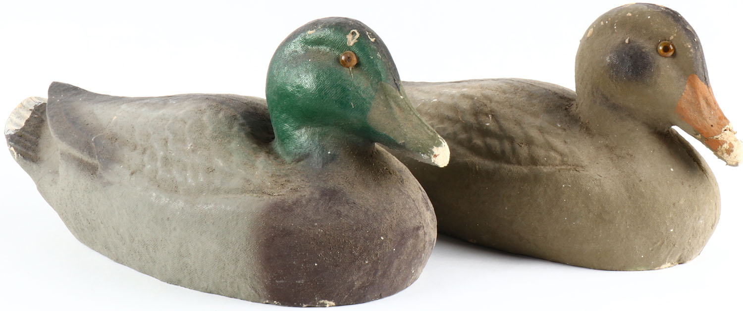 Pair of Mallard Paper Mache' Decoys by Carry Lite Decoys, glass eyes, original paint, wear to bill area. Grade: Very Good - Value: 6 to 30