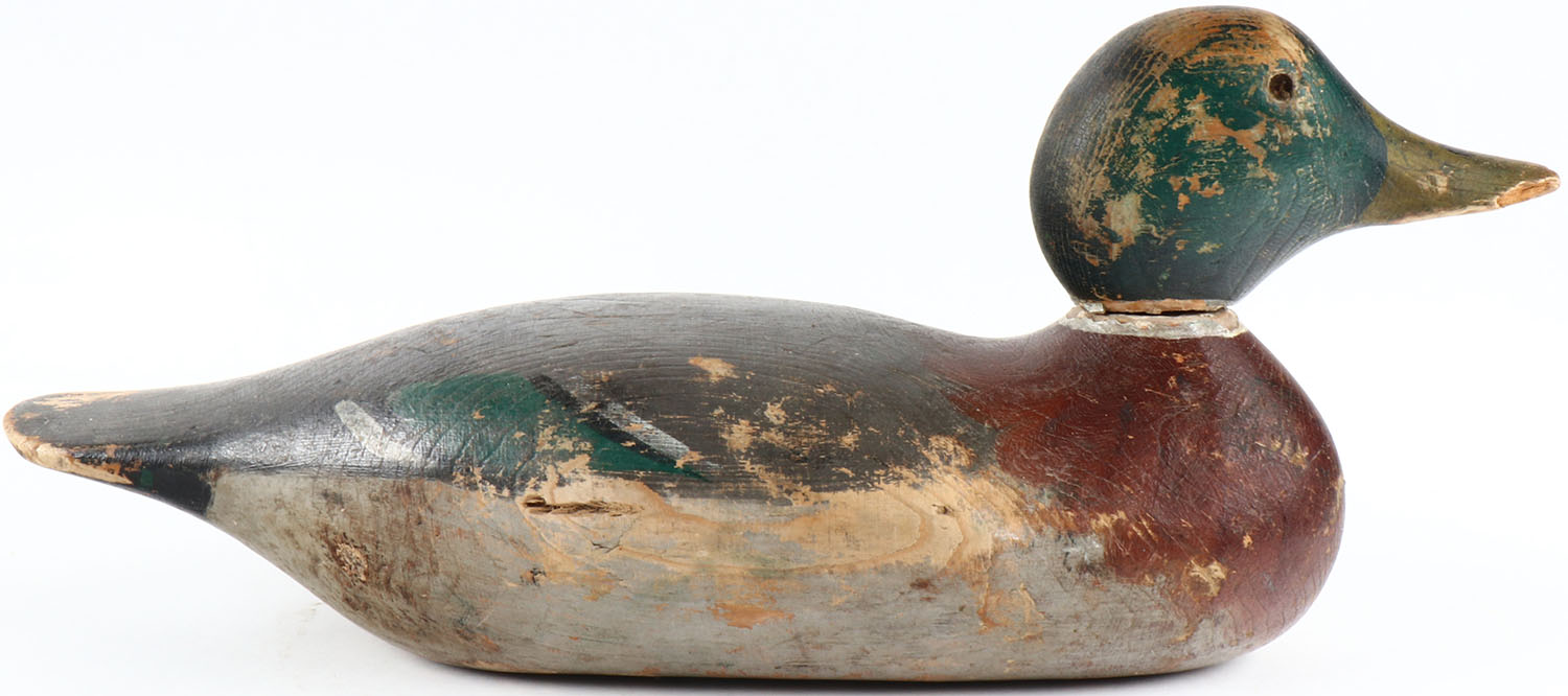 Mallard Drake by Mason Decoy Co., glass eyes, one eye is missing, solid wood, original paint, has chips in bill and age crack on bottom. Grade: Very Good + - Value: 50 to 200