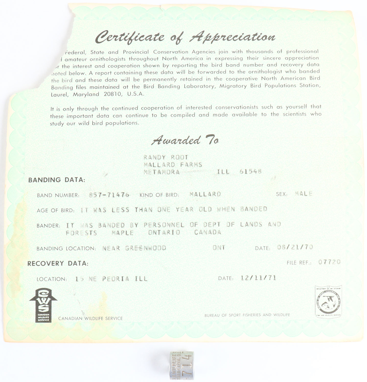 DUCK BAND with certificate from 1970, we are offering a few duck bands that were all shot at one duck club in Peoria IL from 1964 - 1999, ''MALLARD FARMS R R 2'', this one has a certificate, this one was banded in Near Greenwood ONT 08/21/1970 and shot 12/11/1971. Grade: Excellent - Value: 30 to 100