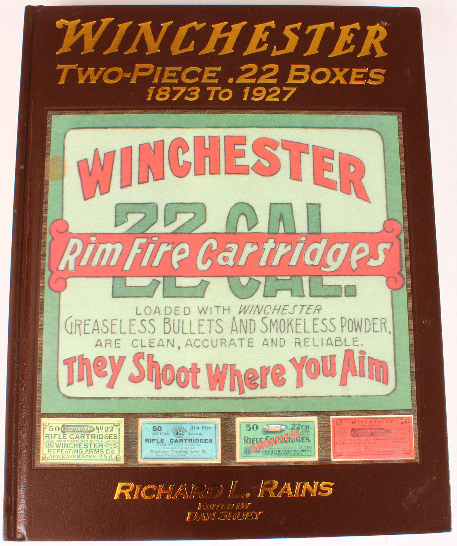 Winchester Two-Piece .22 Boxes 1873-1927 by Richard L. Rains 2006.8 1/2'' x 11''. 211 pages, pages clean, binding tight, hardcover mint, colored images. Value: $80 Grade: MINT - Value: 4 to 80