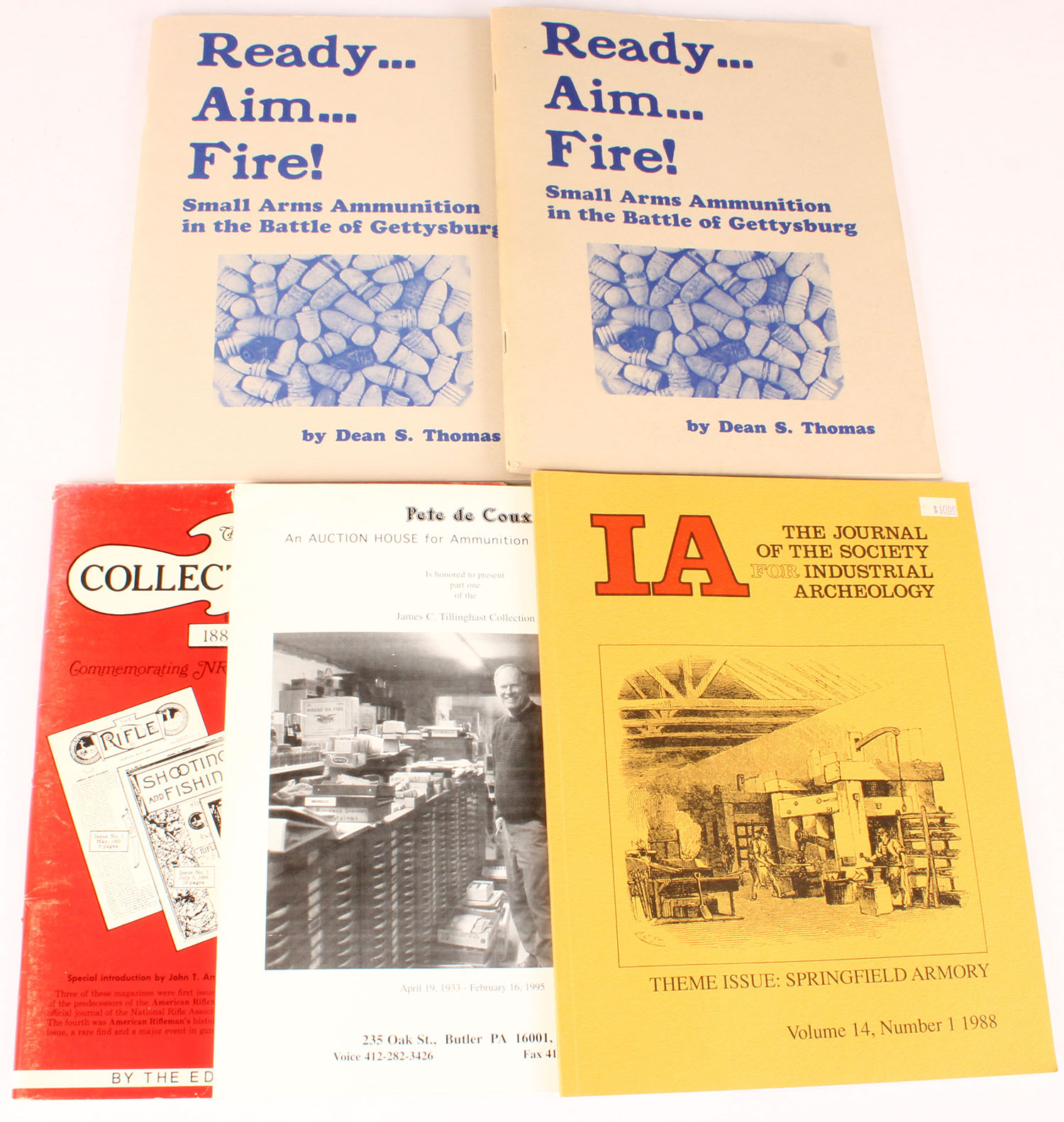 Lot of 5 (2) Ready, Aim, Fire! Small Arms Ammunition in the Battle of Gettysburg by Dean S. Thomas. (1) The NRA Collector's Series. (1) Pete De Coux: An Auction House for Ammunition & Related Items. (1) The Journal Of The Society For Industrial Archeology. All 8 1/2'' x 11''. Grade: Excellent + - Value: 6 to 60
