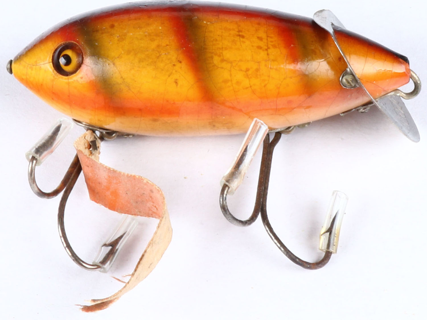 Heddon Crab Wiggler with leather tail, 2 Hook, yellow with red & green strips, GE, L-rig, wonderful finish with a mark to top. Grade: Excellent - Value: 30 to 100