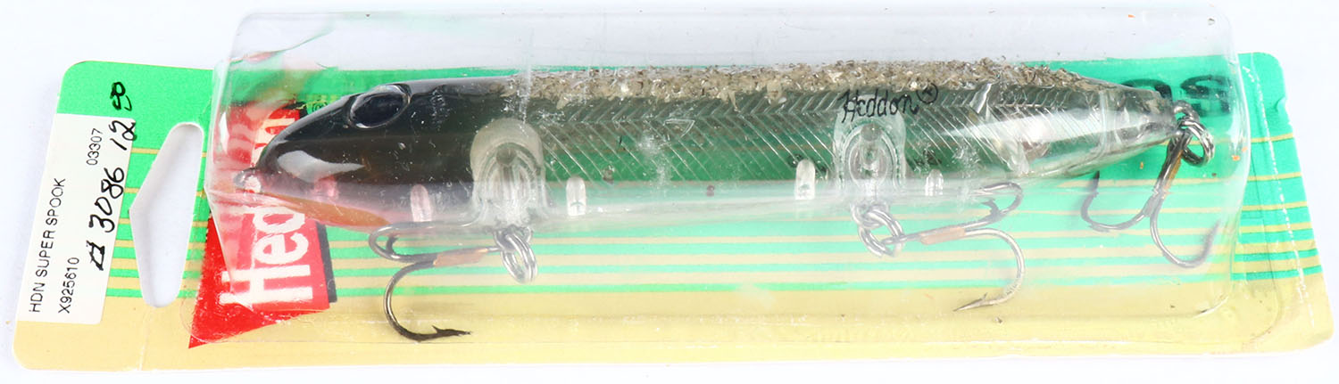 Heddon Super Spook, PE, light gray scale with fleck & ball inside, plastic 3 hooks, has orginal packaging. Grade: MINT - Value: 10 to 40