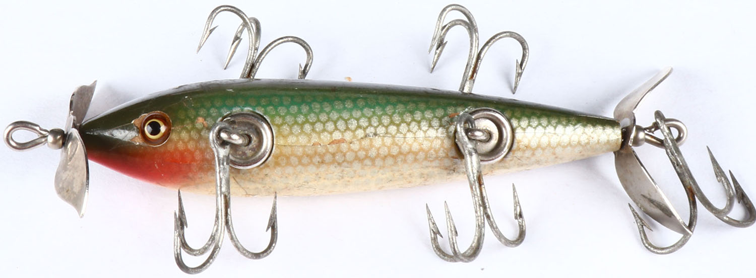 Pflueger Wooden Minnow, 5 Hook Lure, GE, 3 1/2'', Neverfail hardware, green scale shows some chips otherwise very nice. Grade: Very Good ++ - Value: 100 to 200