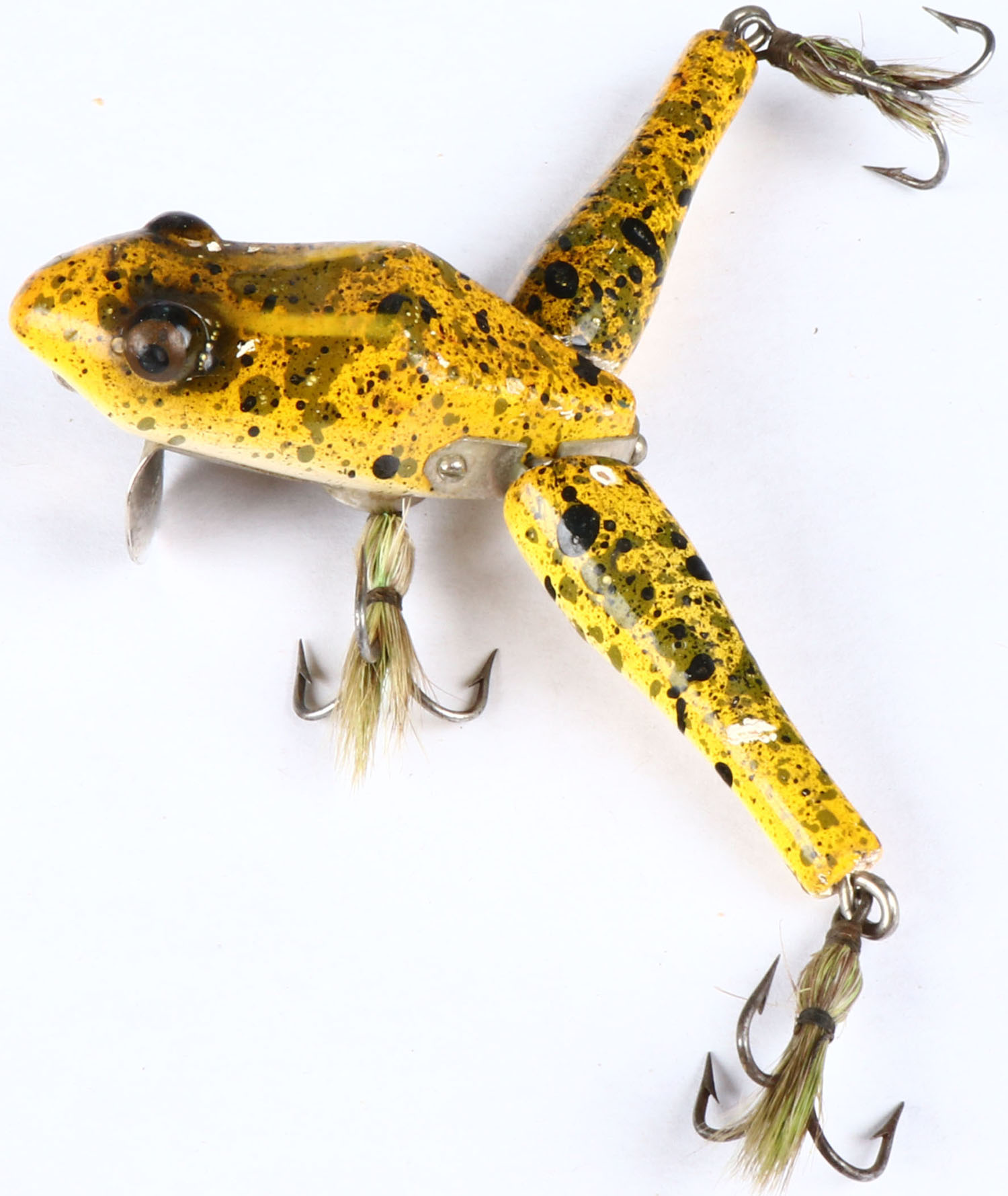 Paw Paw Frog lure, yellow pattern has hair skirts on all three hooks. Grade: Excellent - Value: 10 to 60
