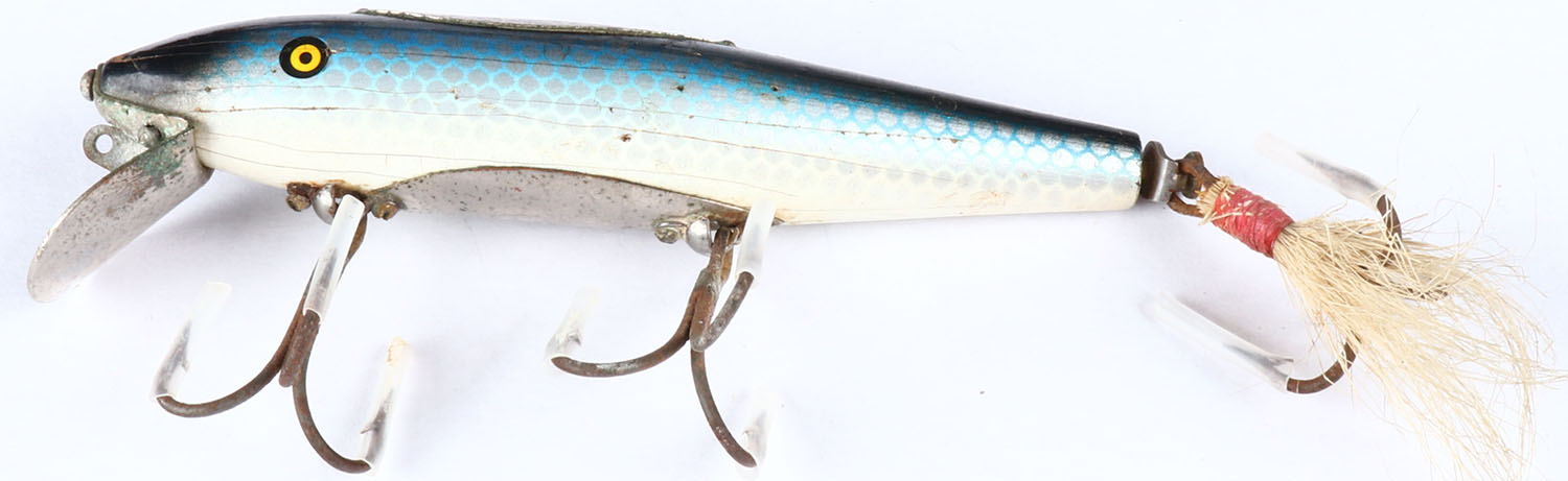 Pflueger Mustang wood lure, PE, blue scale has metal plates top & bottom with hair skirt. Grade: Excellent - Value: 20 to 90