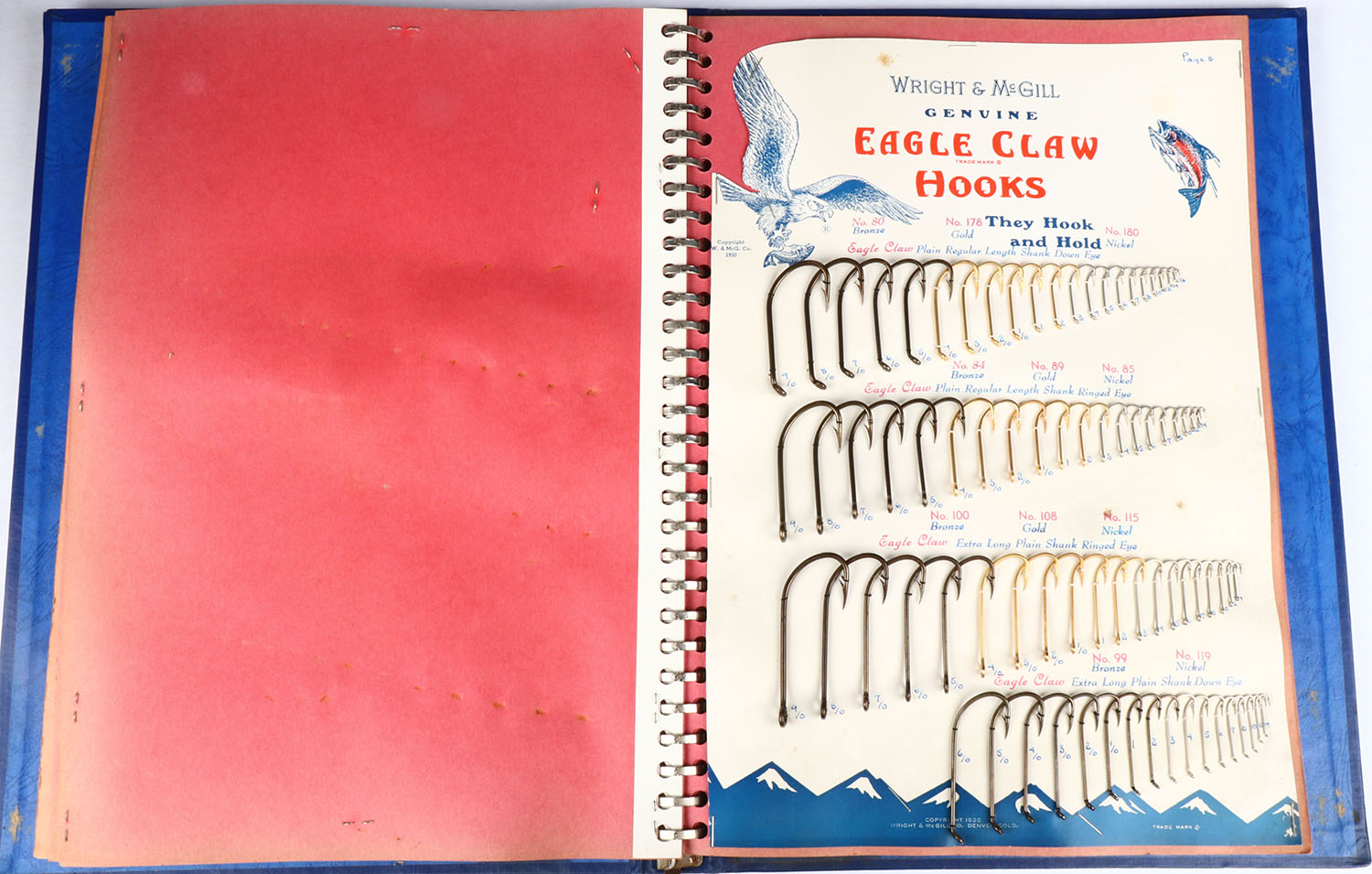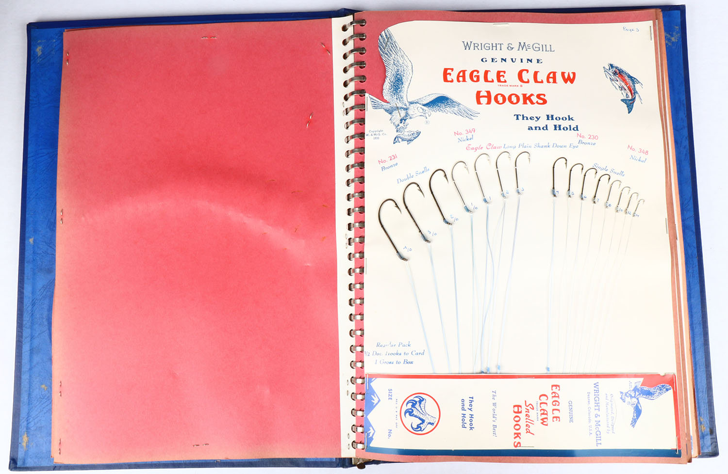Eagle Claw Salesman Sample display binder, as 14 pages & each page has a 8 1/2'' x 11'' card full of hooks for display, each page is different, binder has embossed logo & name. Grade: Excellent ++ - Value: 10 to 60