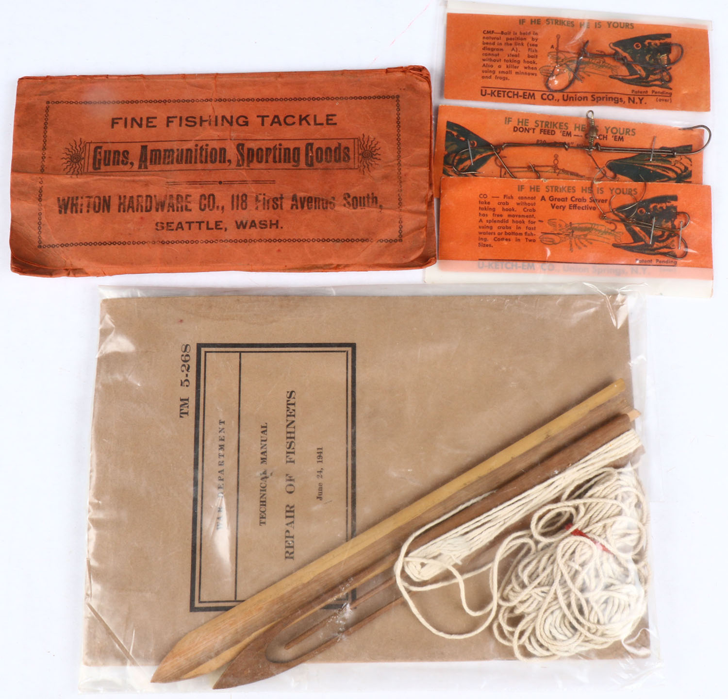Lot of 3 U-Ketch-Em Co. hook harness on cards with a fishing net repair kit & booklet. Grade: Excellent - Value: 10 to 30