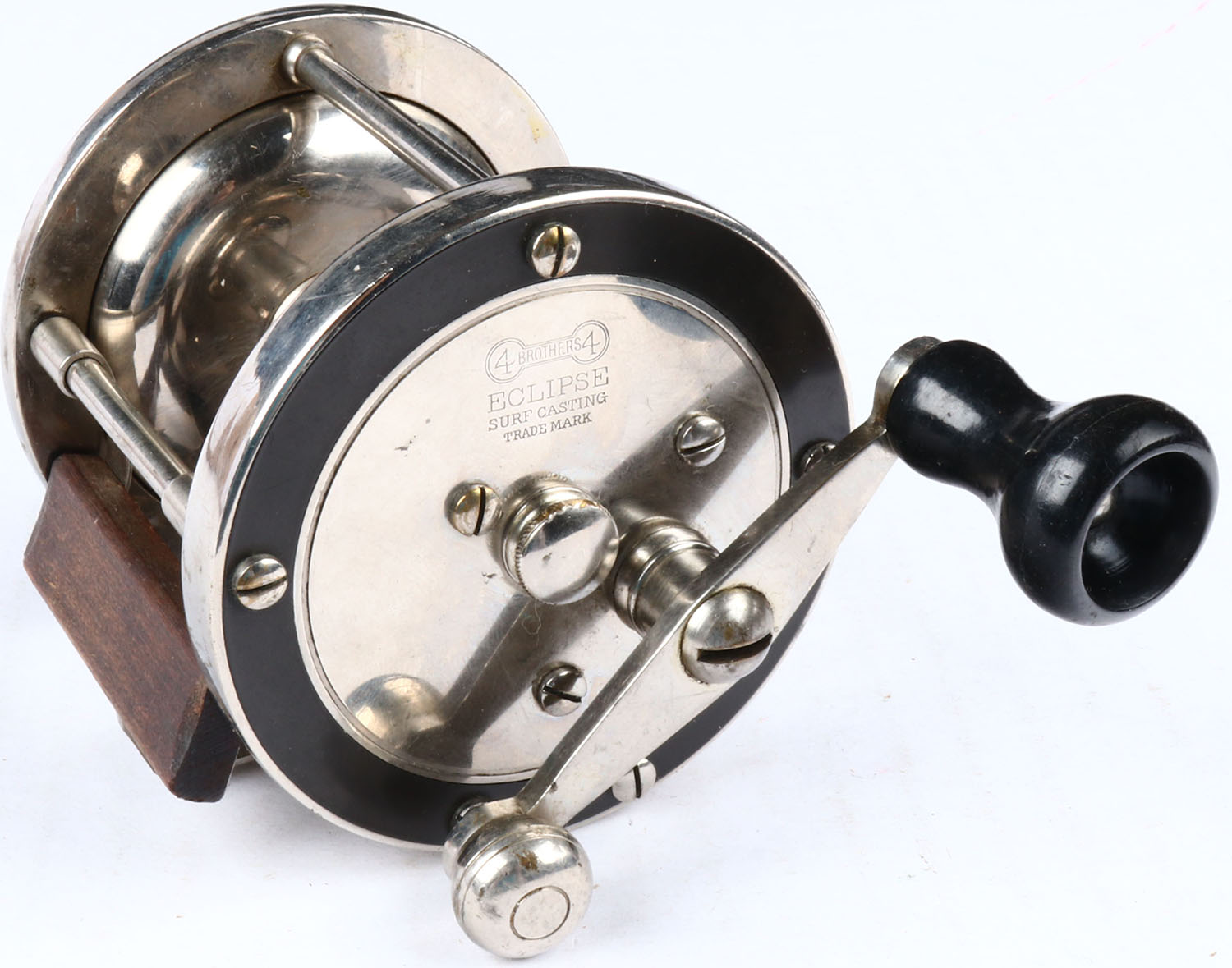 Four Brothers Eclipse surf casting reel, has wood thumb break, black single handle. Grade: Excellent + - Value: 10 to 50