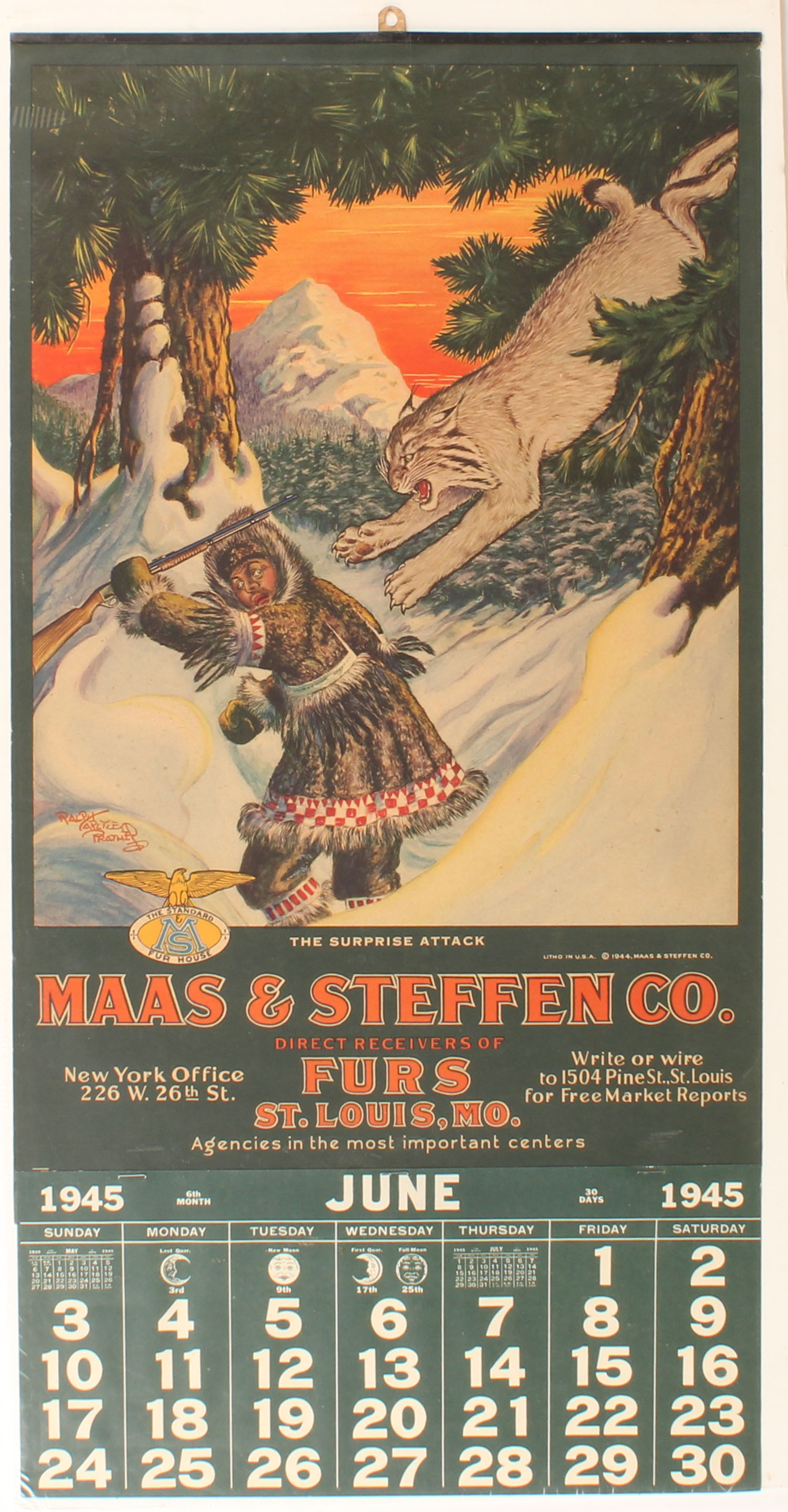 Maas & Steffen 1945 Calendar, ''THE SURPRISE ATTACK'', pictures tapper in deep snow and a lynx jumping out of tree to attack, great color image, artist Ralph Carlyle Prather, 13 1/2'' x 26 1/2''. Has metal band & hanger, has great color with light edge wear, June page, Rare as we do not seen this one very often. Grade: Excellent - Value: 1000 to 3000