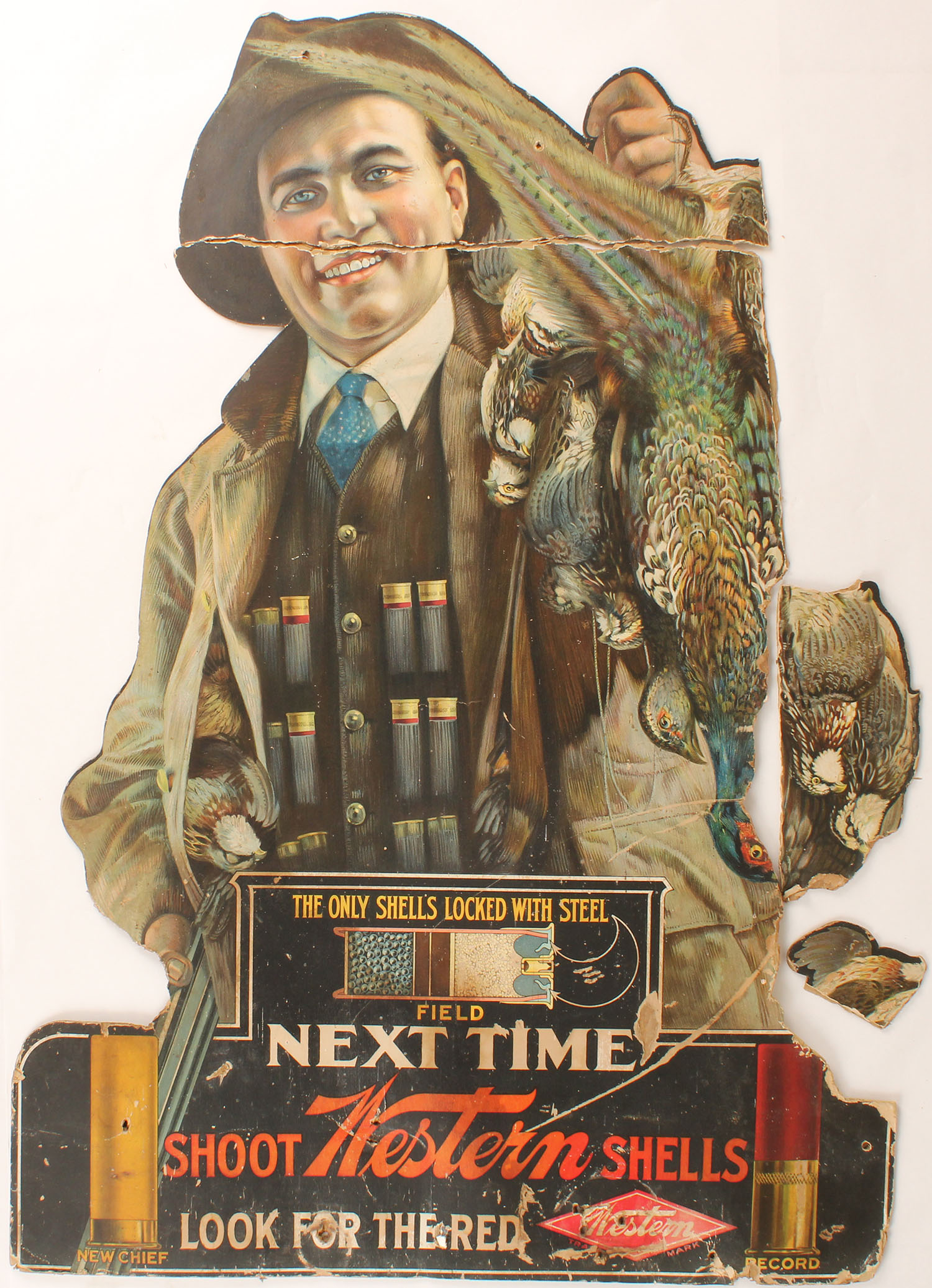 RARE Western Diecut ''THE ONLY SHELLS LOCKED WITH STEEL, FIELD NEXT TIME SHOOT WESTERN SHELLS, LOOK FOR THE RED (Western red diamond logo), ''NEW CHIEF & RECORD'', pictures hunter holding pheasants & quail, 26 1/2' X 39'', has tears & edge wear, this is very rare & the only one we have seen! Grade: Good ++ - Value: 400 to 2000