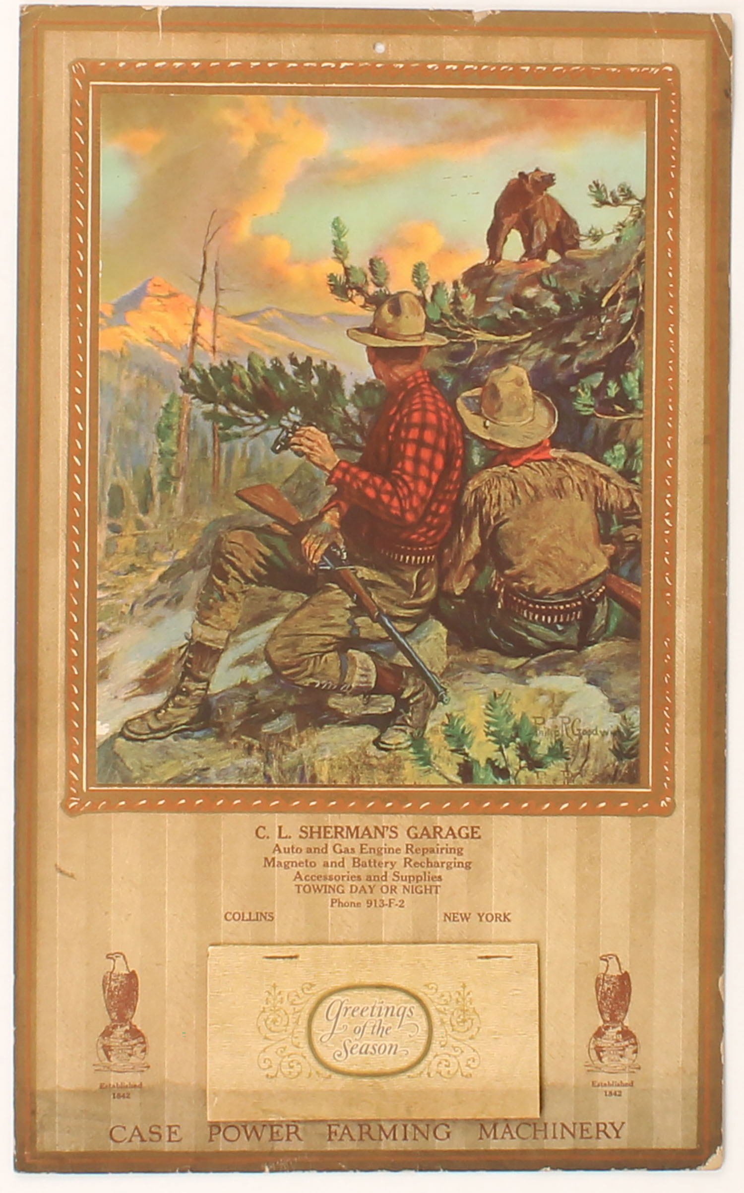 1928 Philip R Goodwin calendar pictures two hunters on cliff with bear coming up from behind, full pad of pages, adv. For Case Power Farming Machinery, 10'' x 17''. Grade: Excellent - Value: 20 to 200